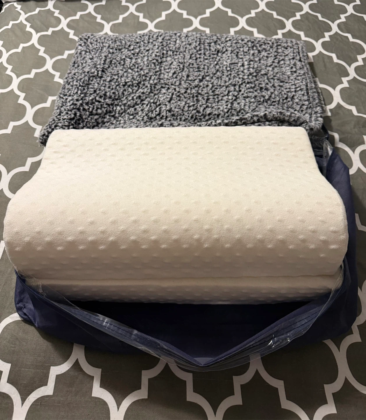 Selling a cozy grey sherpa blanket and two memory foam pillow set! It comes in a convenient carrying case, perfect for storage or travel. The blanket is super soft and warm, ideal for snuggling up on the couch. The pillow is also very comfortable and supportive.