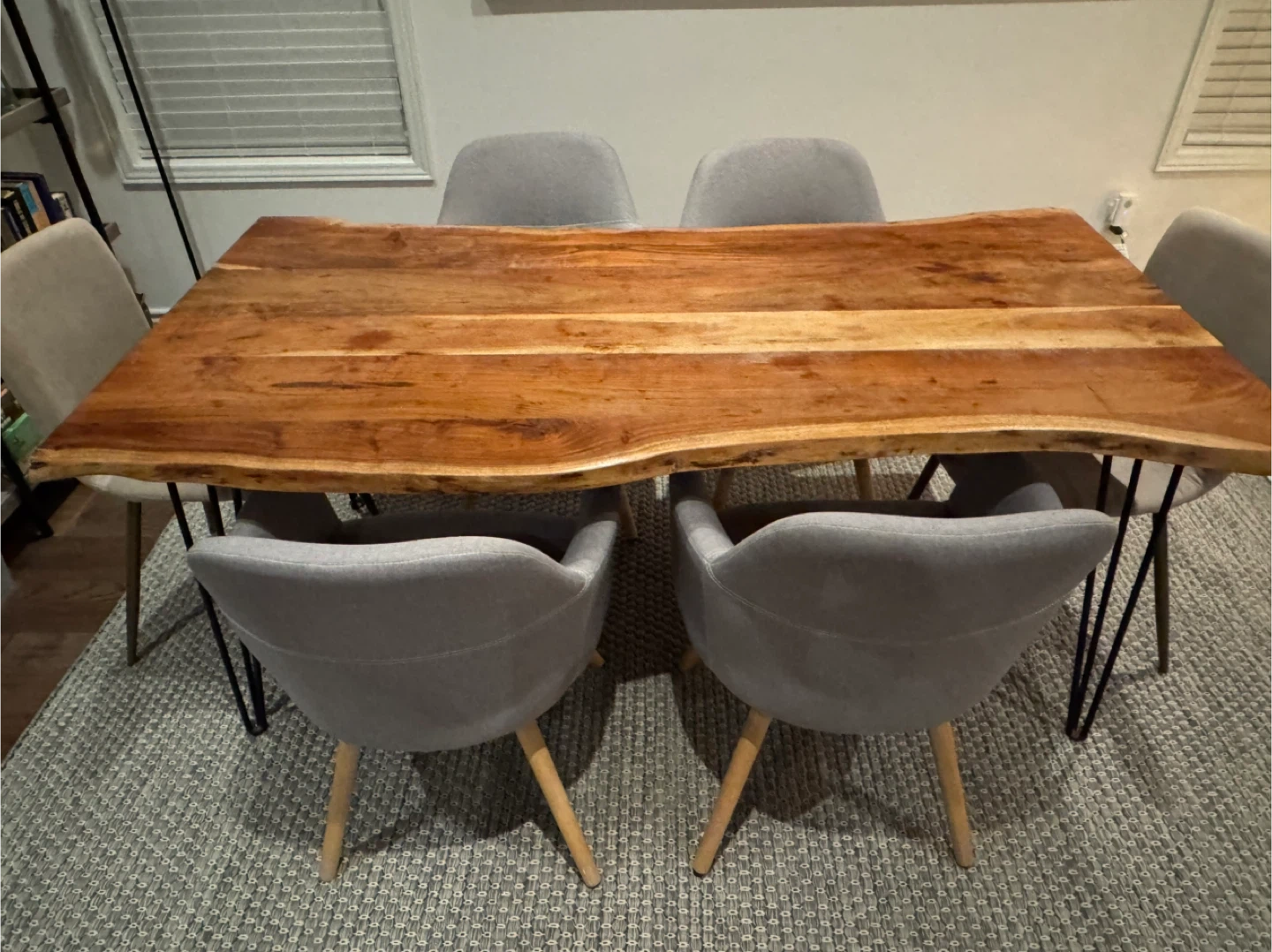 Some wood damage and wear, but perfect for a DIY project or someone handy with sanding. Table is sturdy and functional .