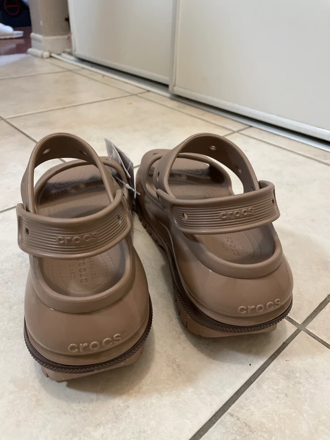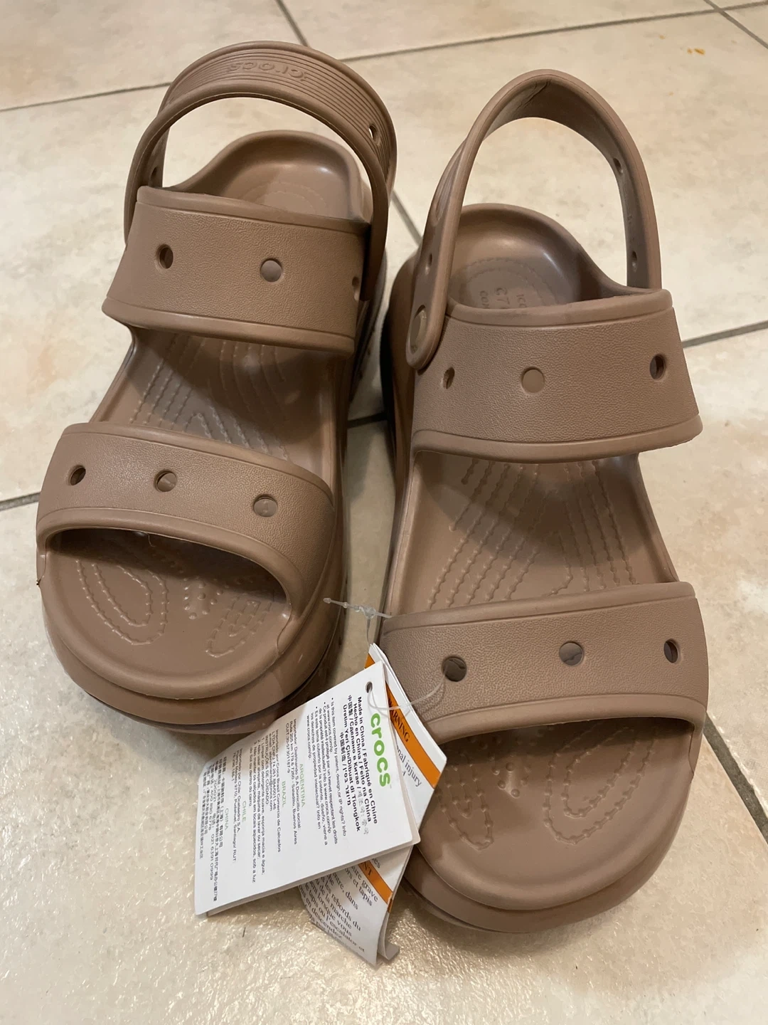 Selling a pair of Crocs sandals in a women's size 7 They are new with tag. Never use. The colour is a neutral brown/taupe.
