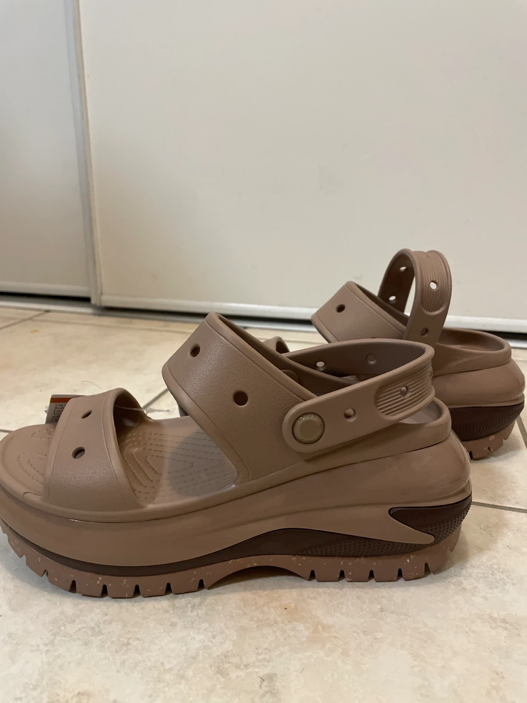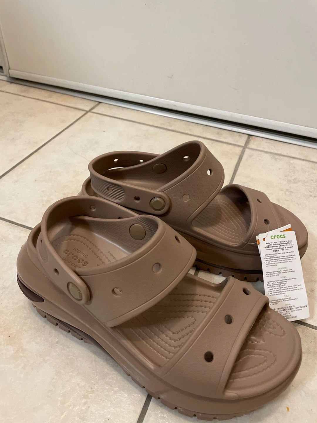 Selling a pair of Crocs sandals in a women's size 7 They are new with tag. Never use. The colour is a neutral brown/taupe.