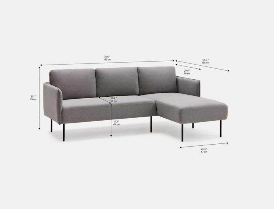 Modern dark grey fabric sectional sofa with chaise lounge and sleek black legs. Excellent condition. Measurements provided in images.