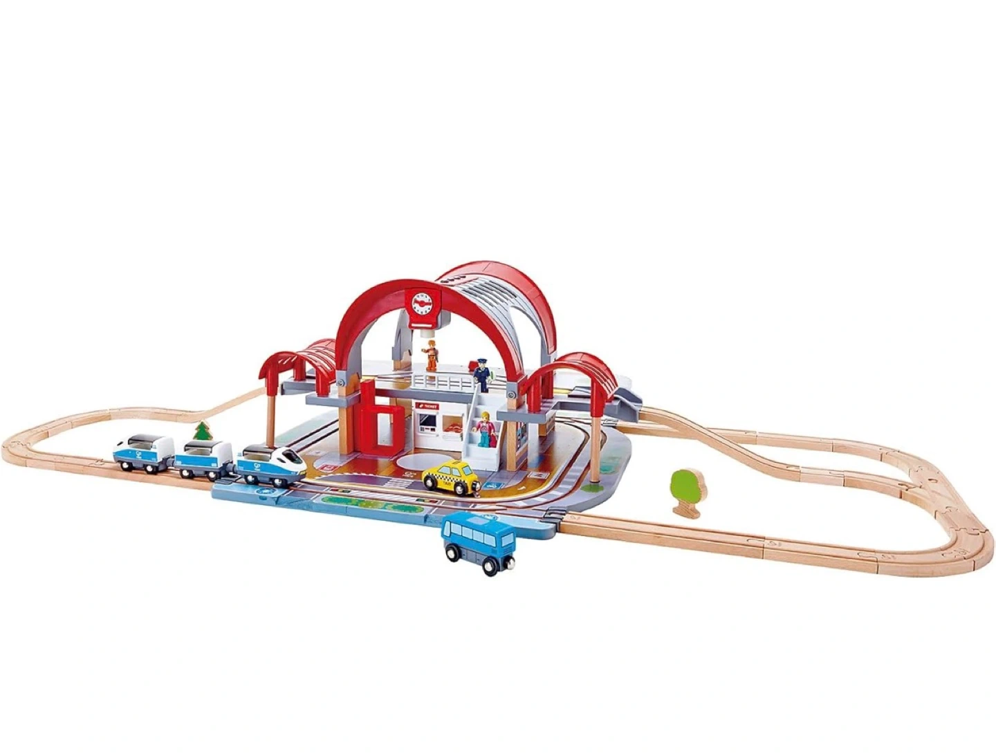 Selling a brand new (unopened) Hape Grand City Station wooden train set! It features a detailed train station with lights and sounds for a fun, interactive play experience. Comes with a variety of accessories to create an engaging rail station scene.