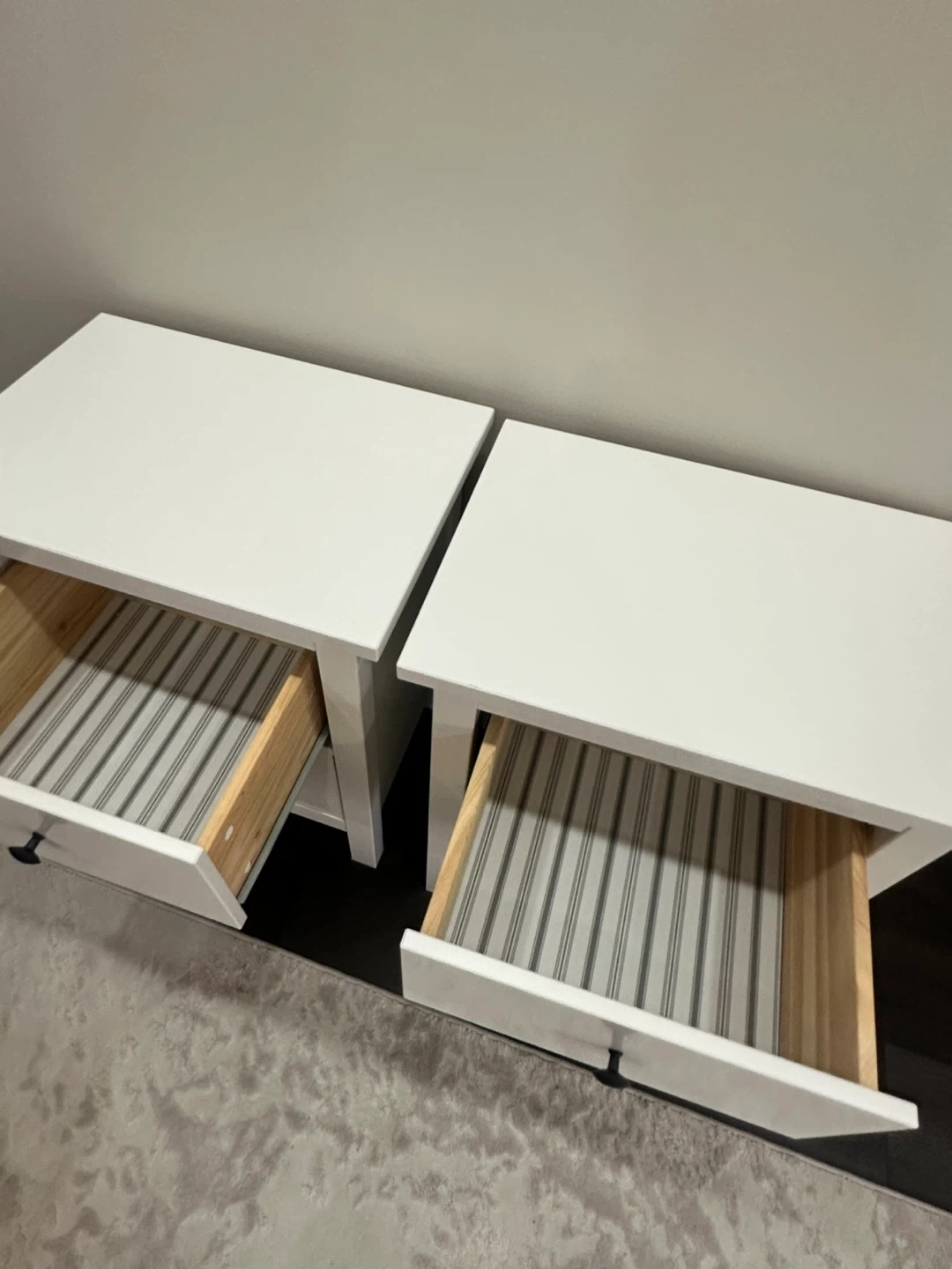 Selling a set of two IKEA Hemnes nightstands in white. They're in good shape and have two drawers each for storage. The inside of the drawers have a nice striped pattern. Perfect for adding some simple style to your bedroom! White gloss model. $100 each