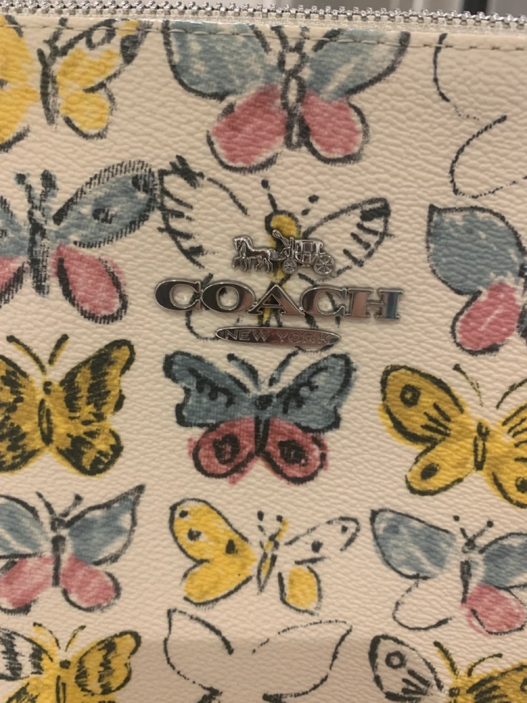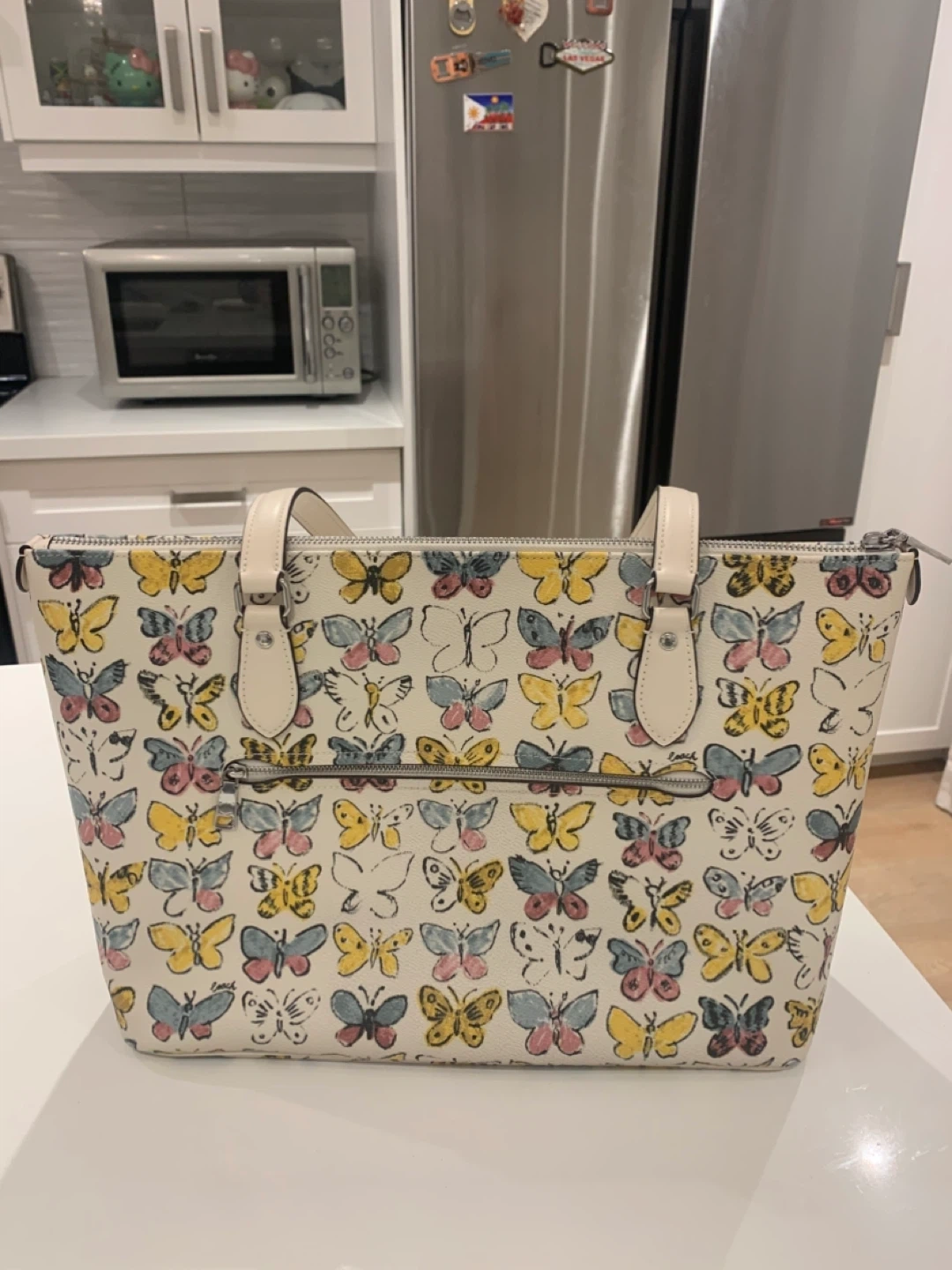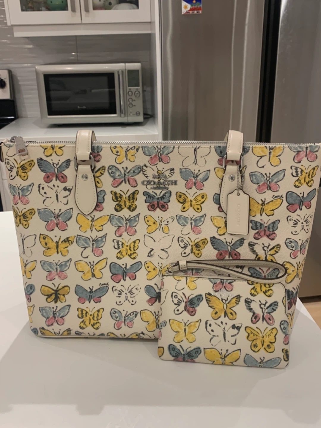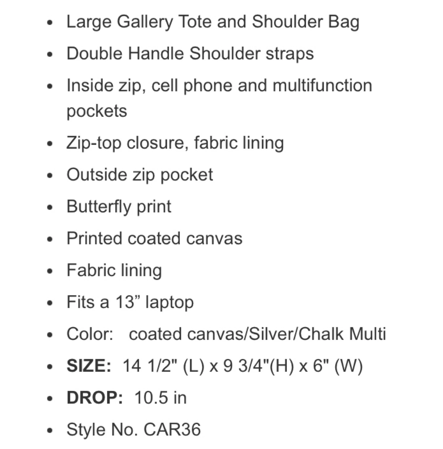 🦋 Selling a Coach Gallery Tote and Wristlet set with a cute butterfly print! - Large Gallery Tote and Shoulder Bag - Double Handle Shoulder straps - Inside zip, cell phone and multifunction pockets - Zip-top closure, fabric lining - Outside zip pocket - Butterfly print - Printed coated canvas - Fabric lining - Fits a 13" laptop - Color: coated canvas/Silver/Chalk Multi - SIZE: 14 1/2" (L) x 9 3/4"(H) x 6" (W) - DROP: 10.5 in - Style No. CAR36