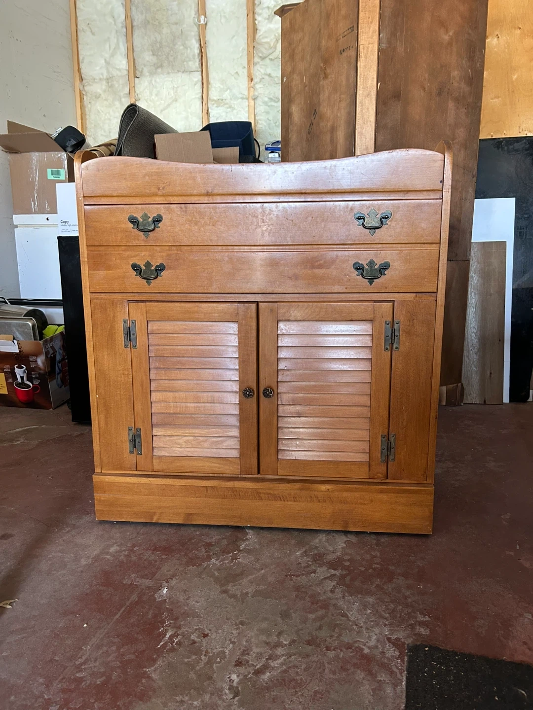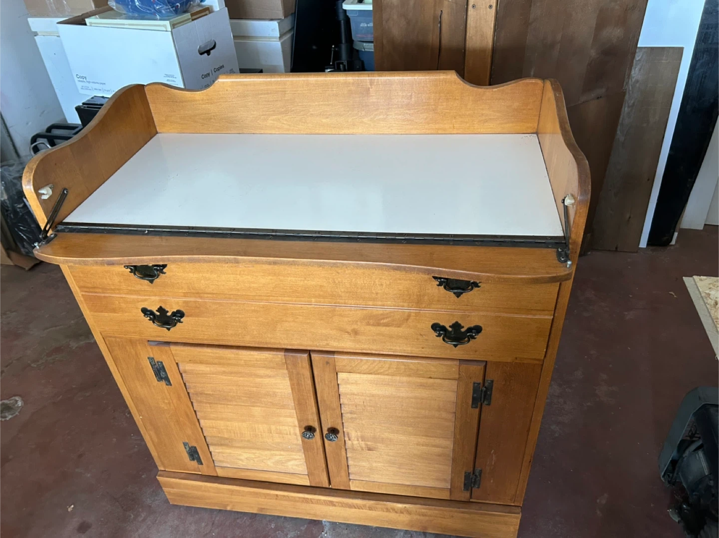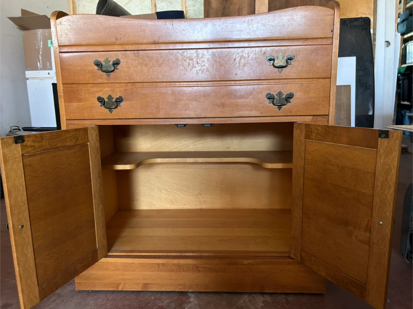 This real wooden change table has a large upper drawer and a lower cupboard with a shelf. The front edge tips down for convenient access