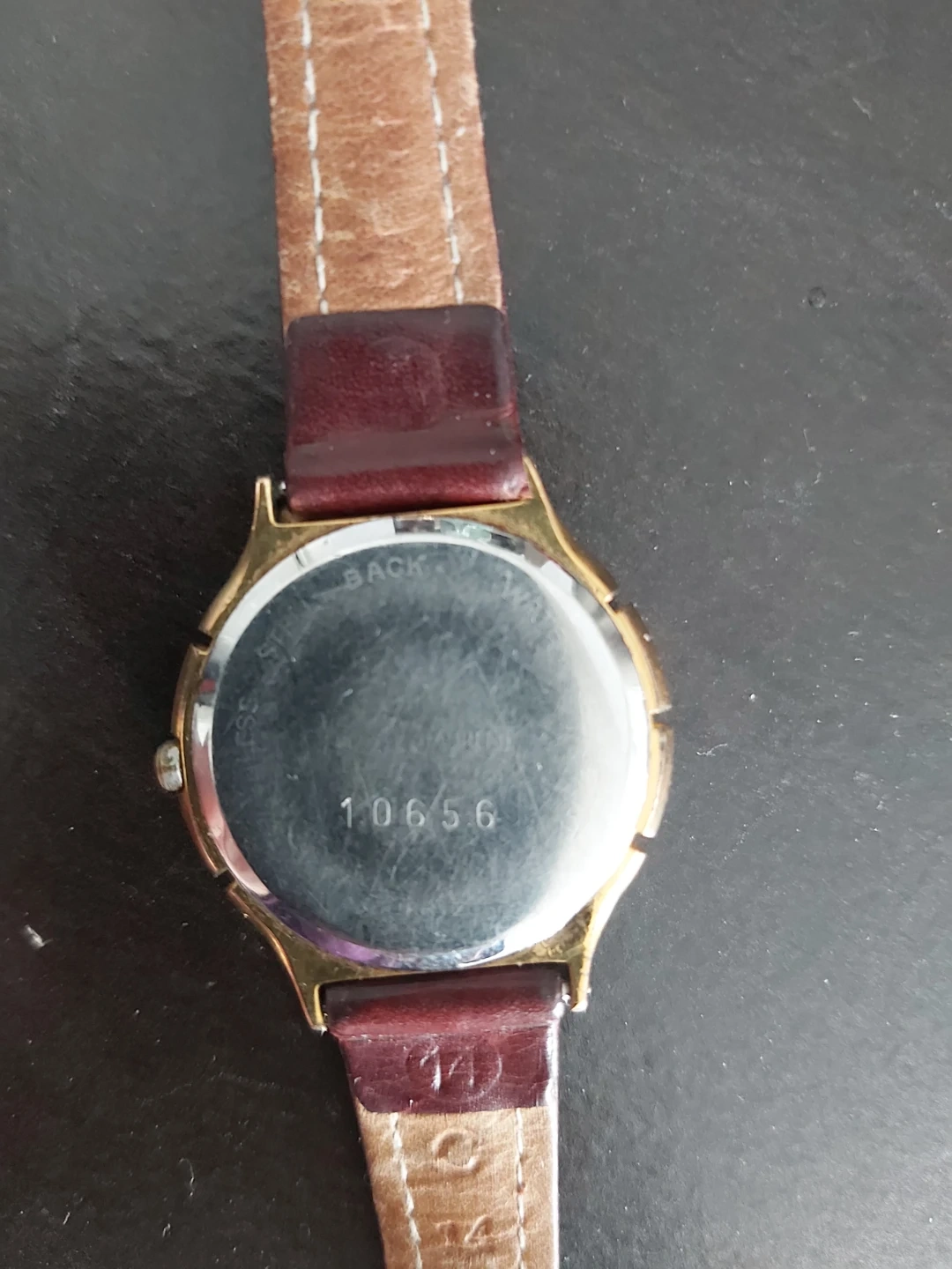 Gold-toned wristwatch. Brown leather band. Analogue face. Pre-owned. Made in France.