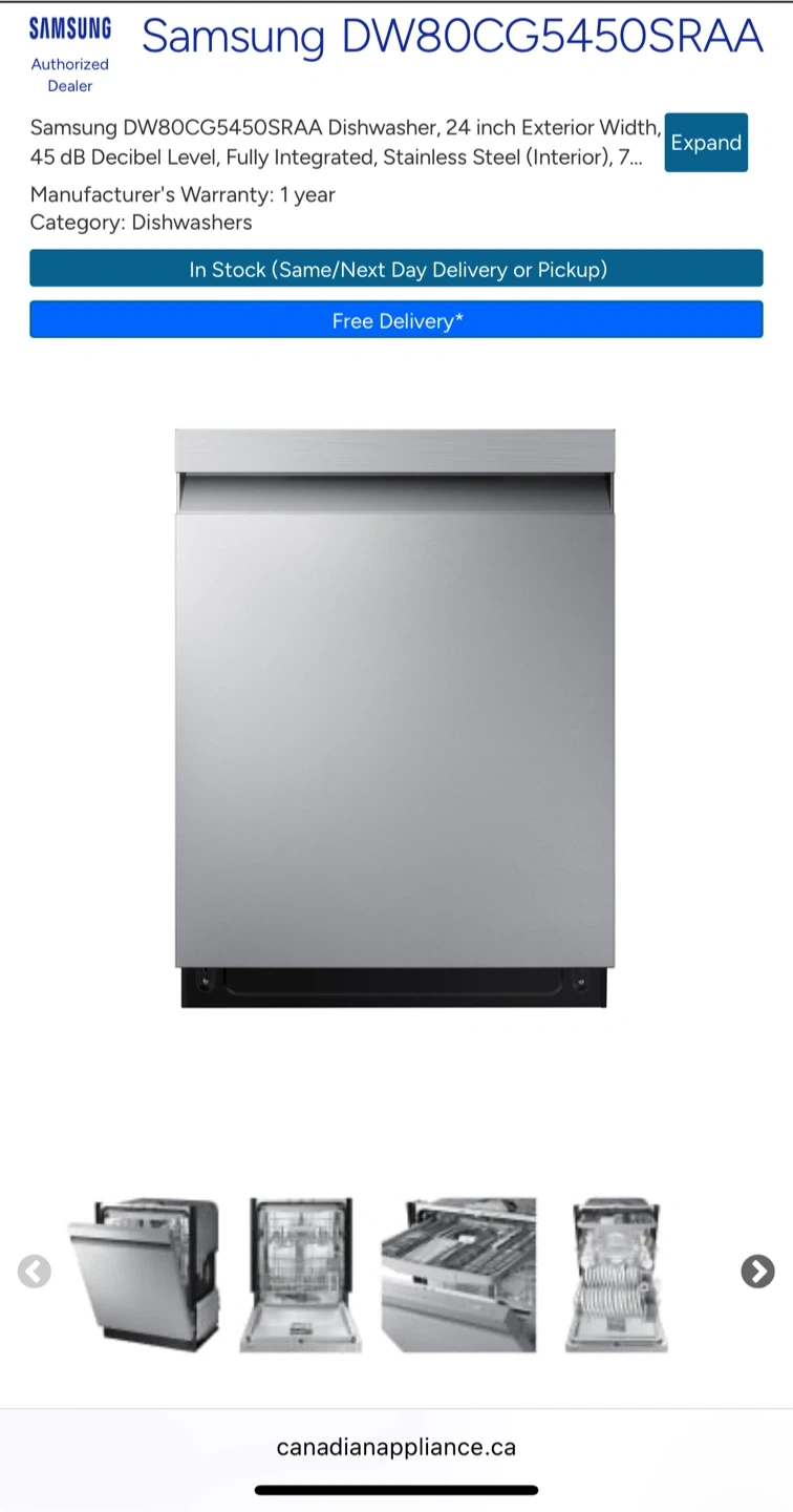 Selling a Samsung DW80CG5450SRAA dishwasher in stainless steel. This dishwasher has a 24-inch exterior width and operates at a 45 dB decibel level. It's fully integrated with a stainless steel interior. Adjustable height between 33 3/4" - 35".