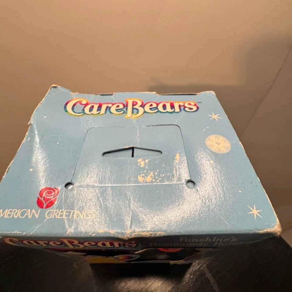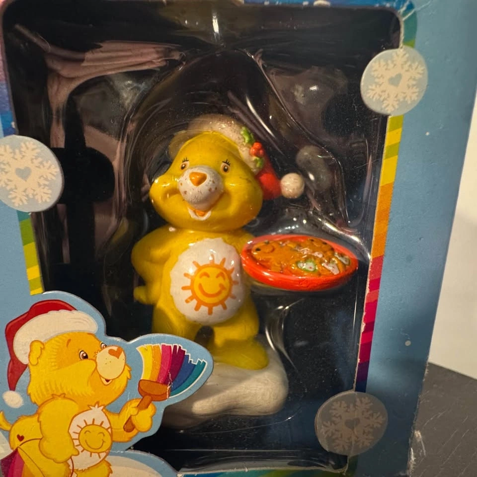 IN ORIGINAL BOX 2004 American Greetings Funshine Care Bear "Homemade Holidays" Christmas ornament. It features the yellow Funshine Bear, known for its smiling sun belly badge, wearing a Santa hat and holding a tray of cookies or a small pizza. The specific design in the lower corner of the box shows the bear with a paintbrush and rainbow paint bucket.