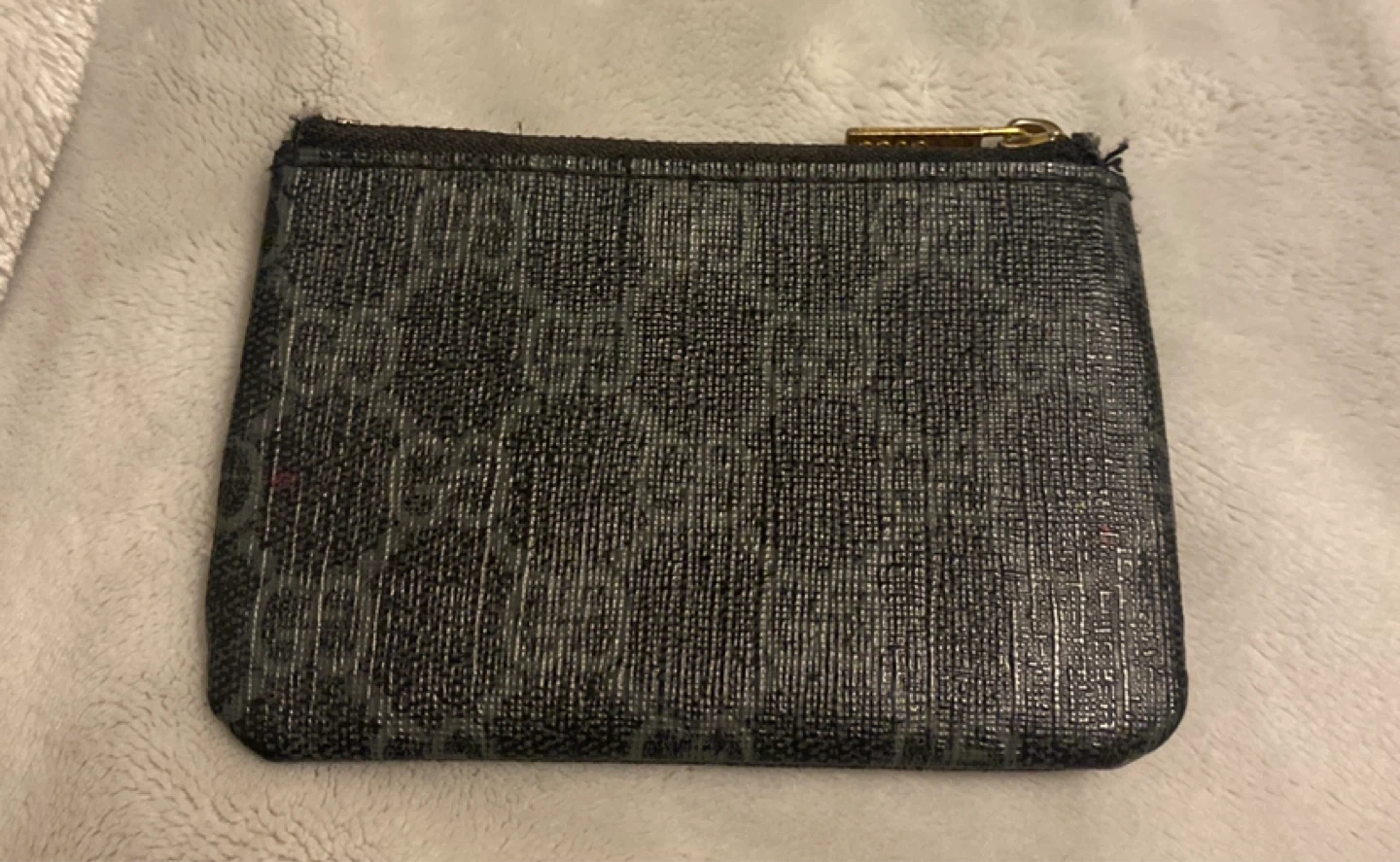 Selling a Gucci coin pouch. It has a black patterned design and a gold zipper. It's in used condition but still has lots of life left!