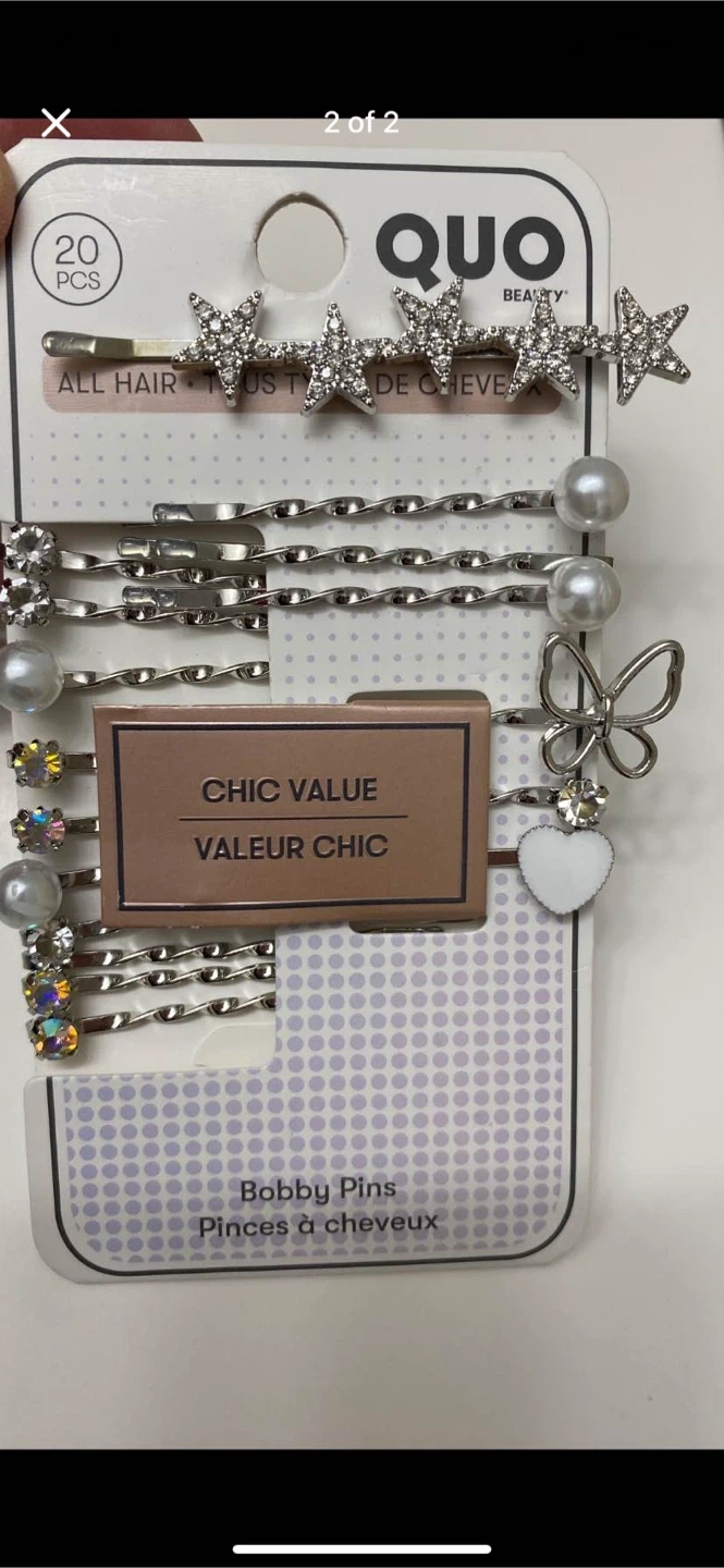 Selling a set of Quo bobby pins, brand new in the package! The pack includes 20 pieces with various decorative designs like stars, pearls, butterflies, and hearts. Chic and stylish for any hairstyle!