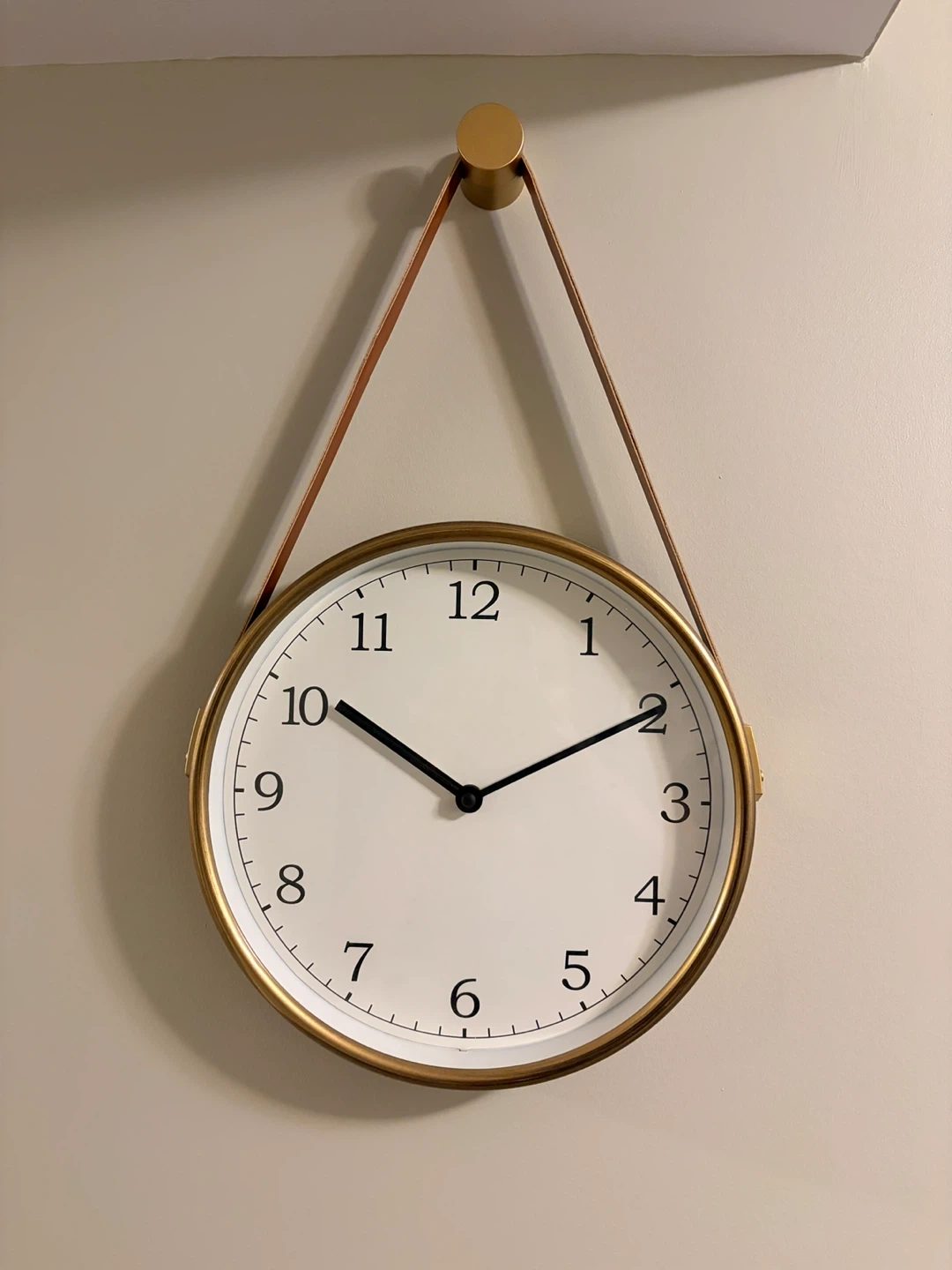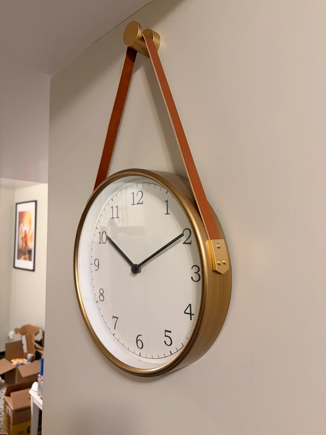 Selling a stylish gold wall clock with a leather strap for hanging. It's in great condition and would look lovely in any room! The clock face is easy to read, and the gold finish adds a touch of elegance