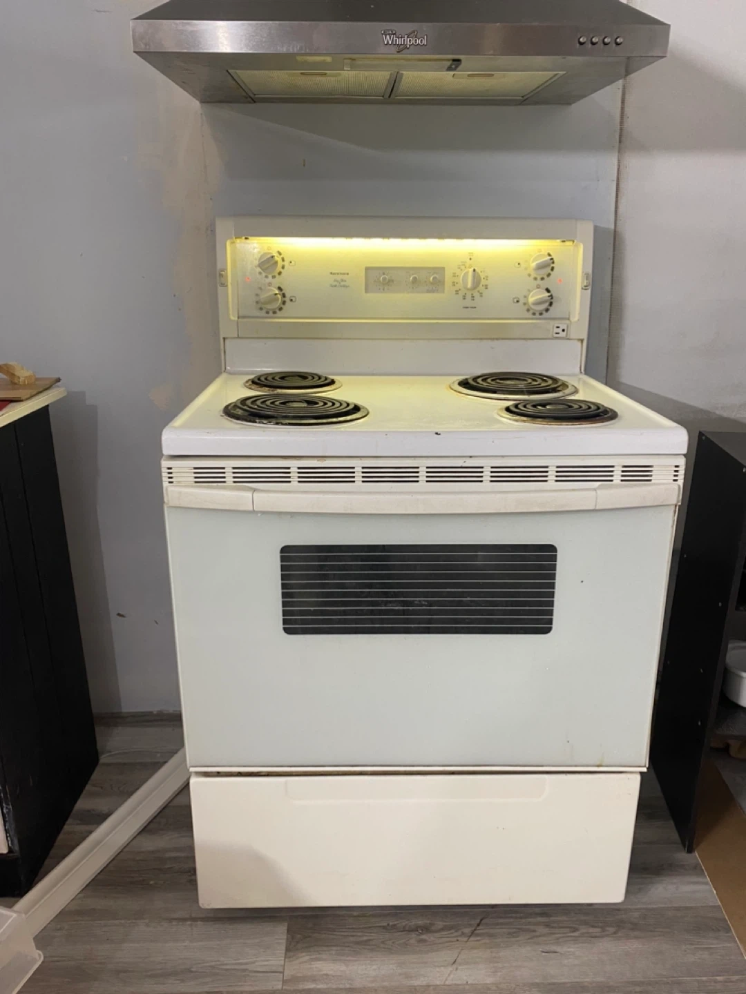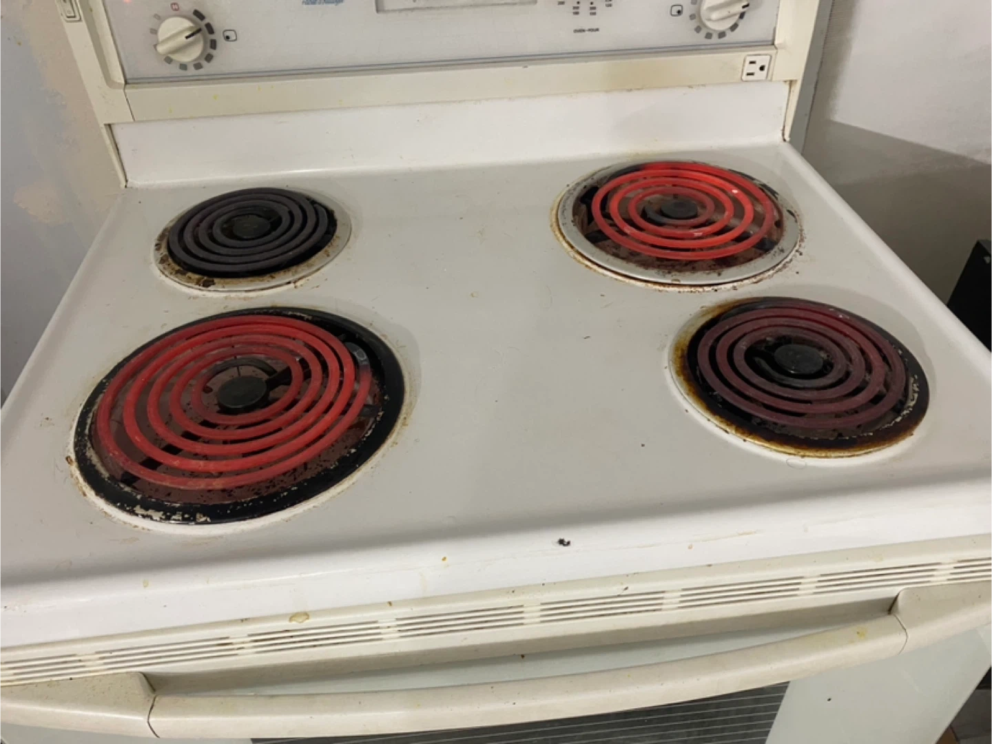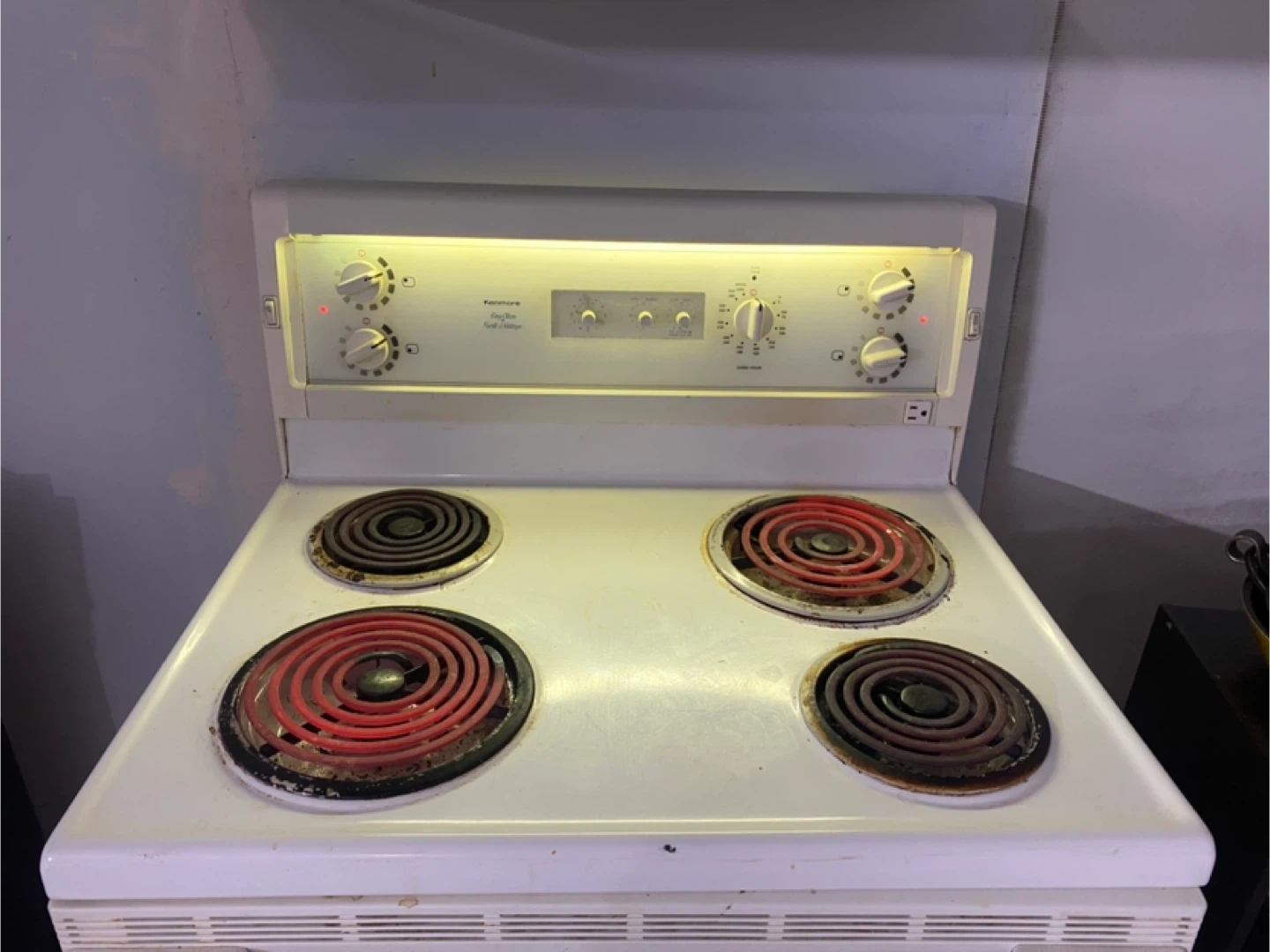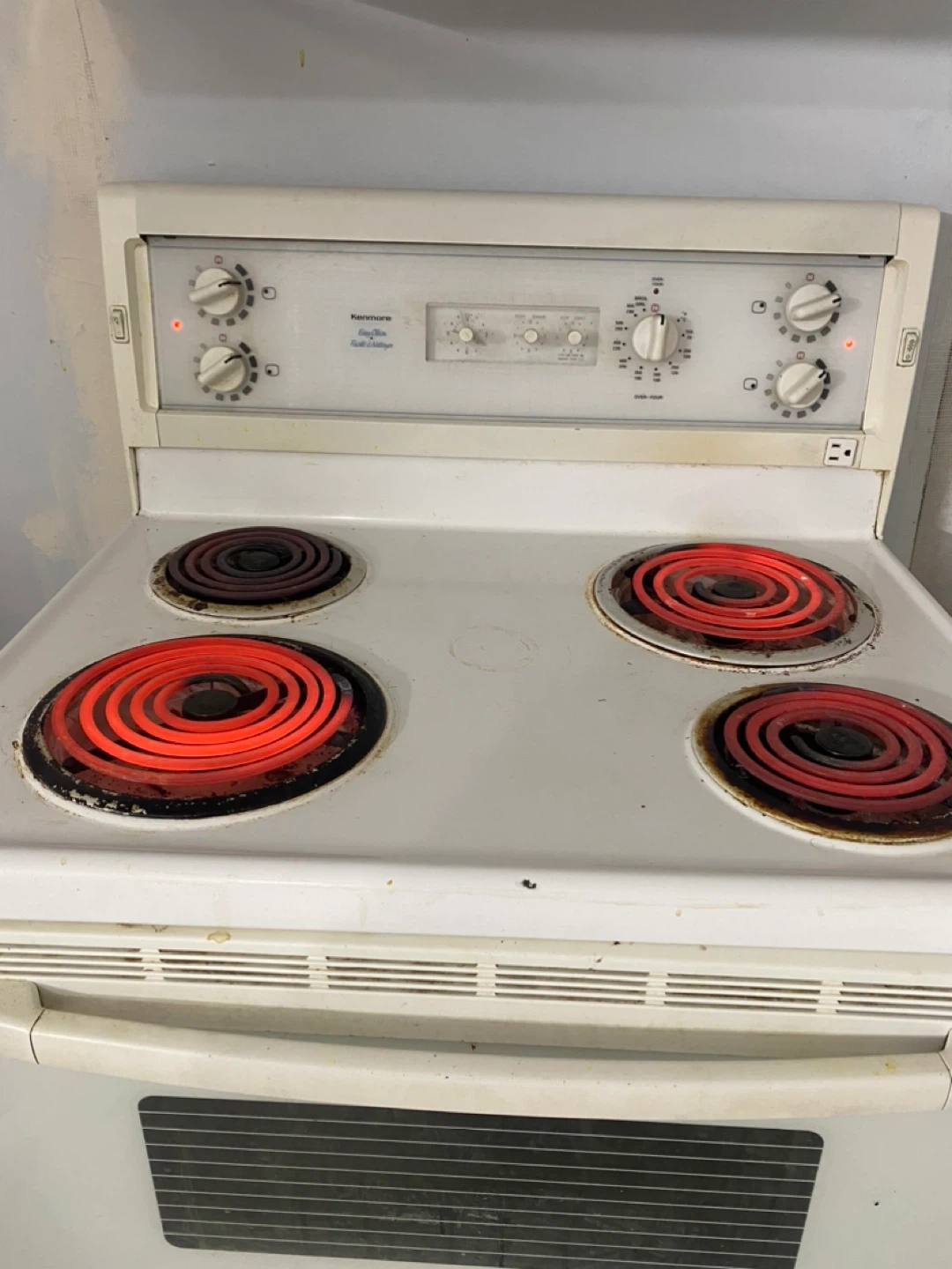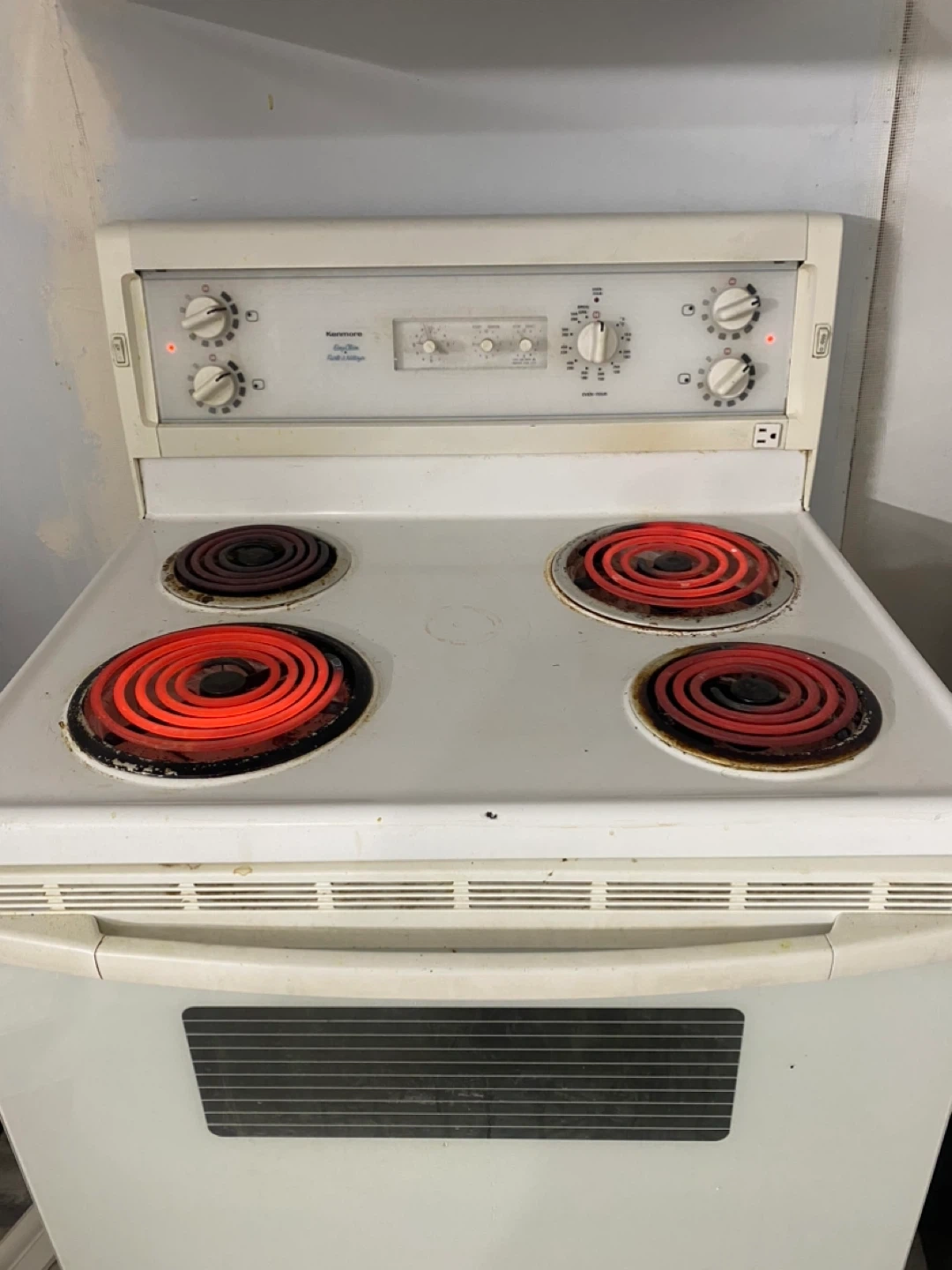 Selling a Kenmore electric coil top range. It has four burners and is white. There are some signs of use, but overall it's in decent shape