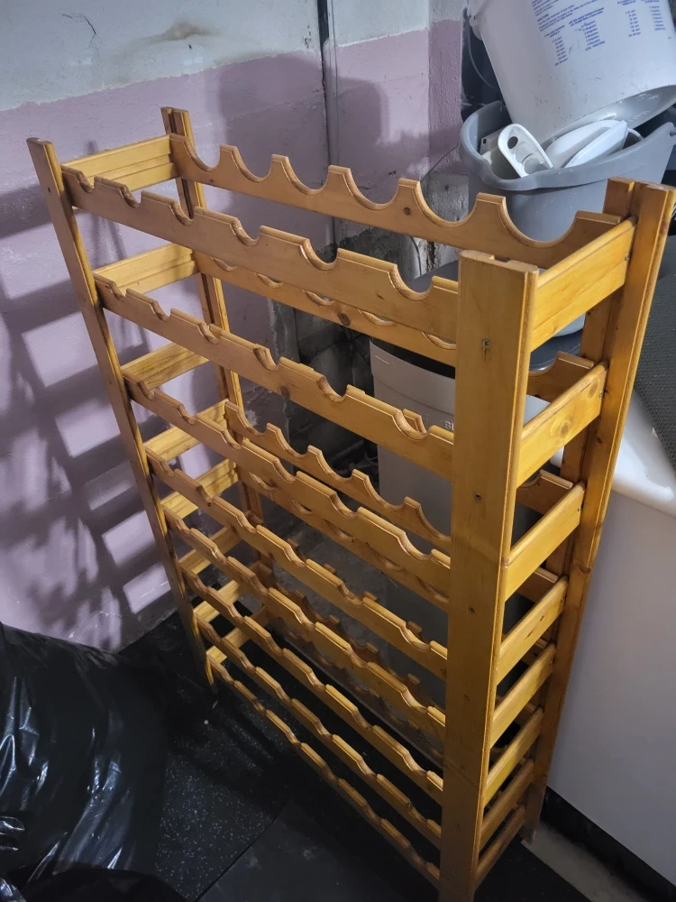 Selling a wooden wine rack that can hold up to 42 bottles. It's in great shape and ready to store your collection!