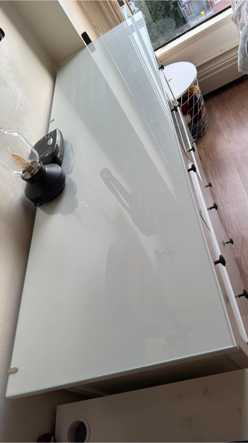 IKEA HEMNES 8-drawer dresser in white stain with custom glass top. Tons of storage and the glass has kept the surface in great shape. One drawer sticks out slightly, but it still opens and closes and is fully functional (shown in photos). Selling because we’re moving.