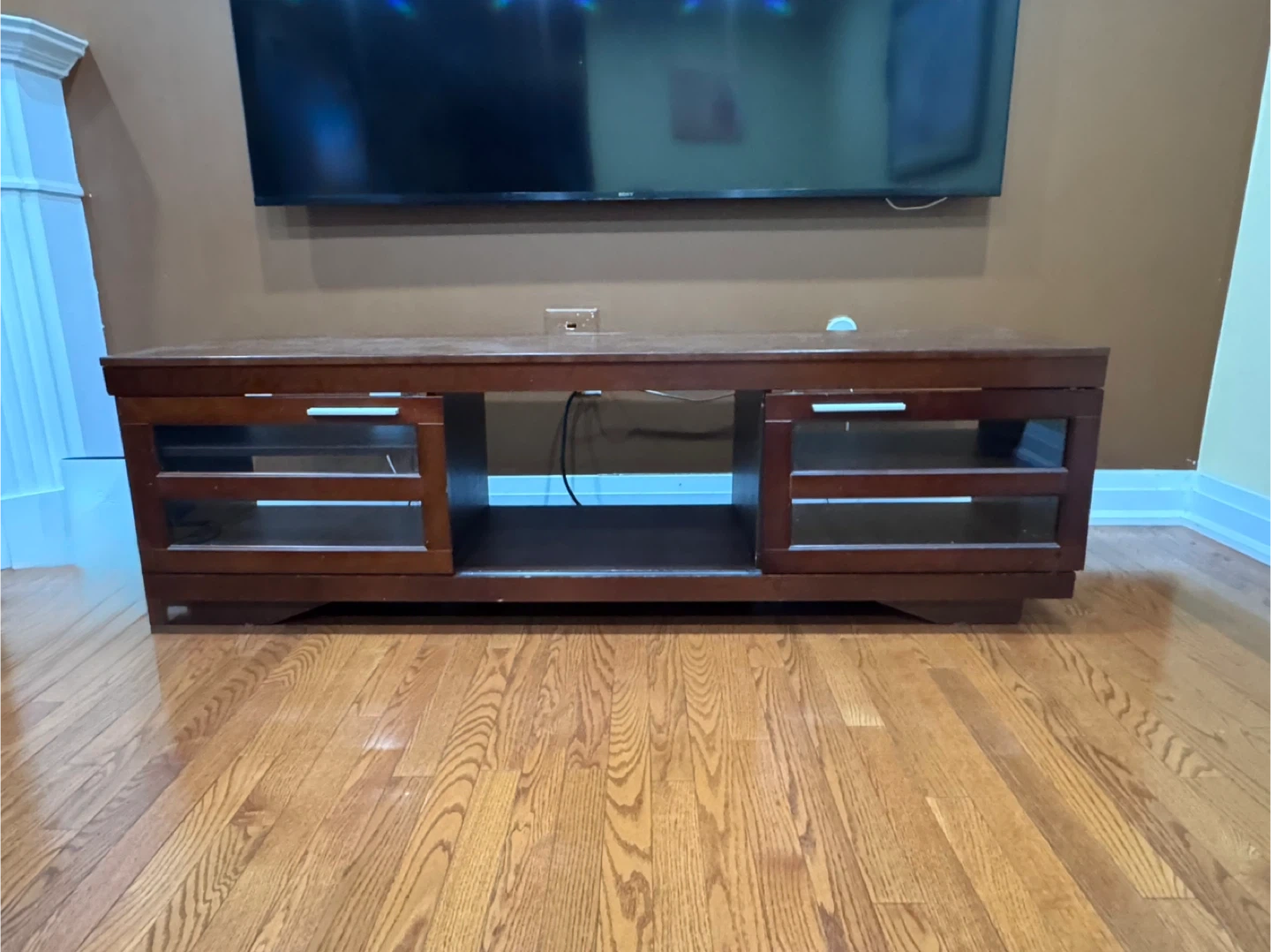 Selling a brown wood TV stand. It's in great shape and ready for a new home theatre setup! Perfect for organizing your entertainment system and adding a touch of warmth to your living room