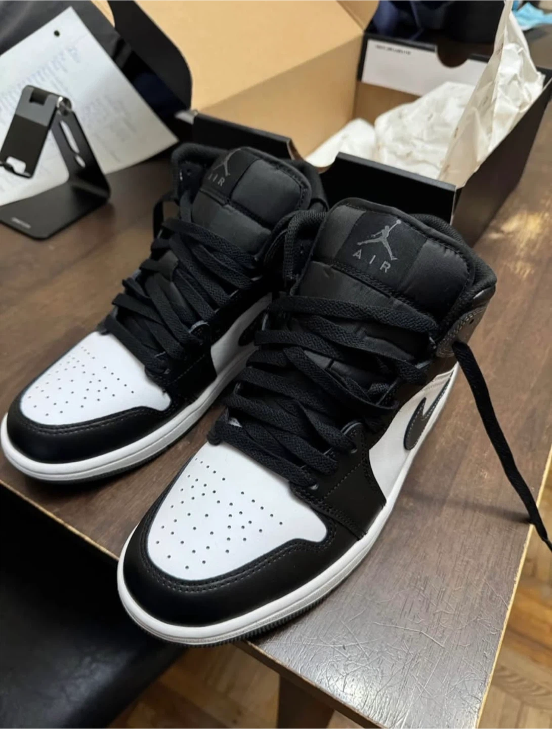 Selling a brand new pair of Air Jordan 1 Mid sneakers in black and iron grey. They are a size 7.5 and come with the original box.