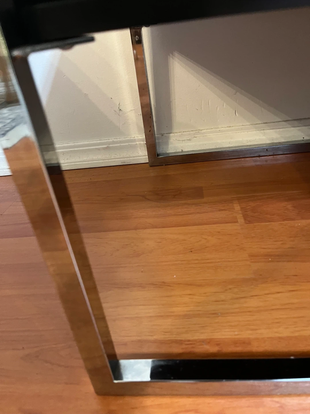 Selling a side table with a sleek chrome frame and a black top. It's in good condition and would look great next to a sofa or bed! The mirrored bottom shelf adds a nice touch.