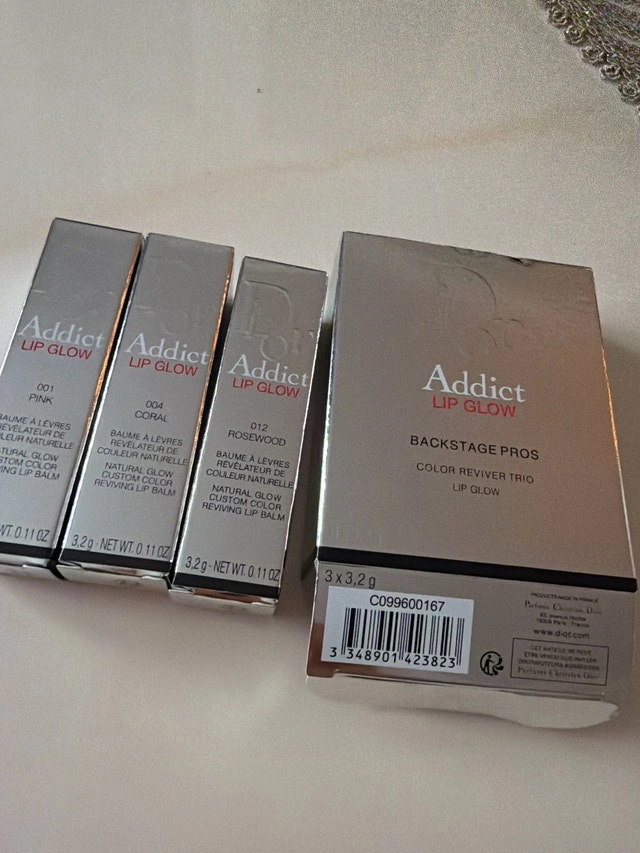 Discover the Dior Addict Lip Glow Backstage Pros Color Reviver Trio, featuring three luxurious lip balms in shades 001 Pink, 004 Coral, and 012 Rosewood, each 3.2g. This set offers a natural, custom colour-reviving lip balm experience. The lip balms have never been used and are in perfect condition.
