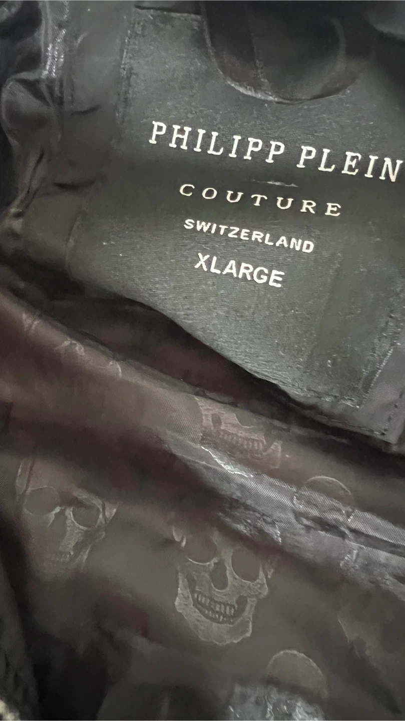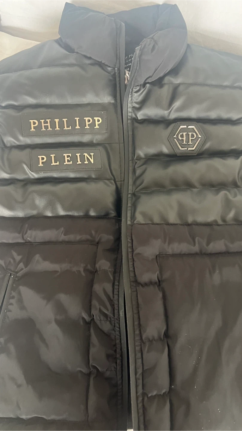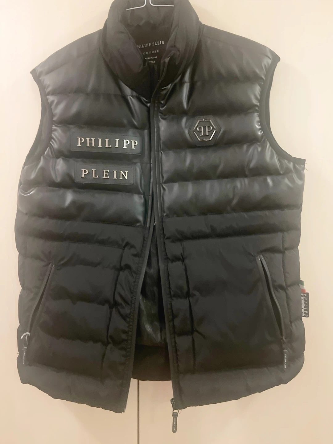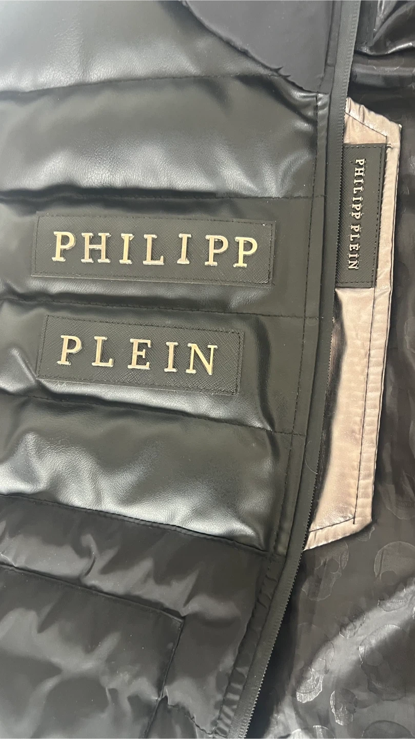 Philipp Plein black puffer vest for men, in excellent condition! It's an XLarge size and features the brand's logo prominently on the front. The vest has a stylish and unique interior lining with a skull pattern. It's made in Italy