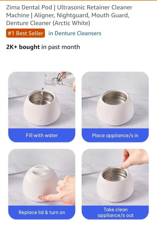 Keep your dental appliances sparkling clean with the Zima Dental Pod! This ultrasonic cleaner is perfect for aligners, retainers, nightguards, mouthguards, and dentures. It features an automatic cleaning cycle and patented technology. It's engineered in the UK and super easy to use: just fill with water, place your appliance in, replace the lid, and turn it on!