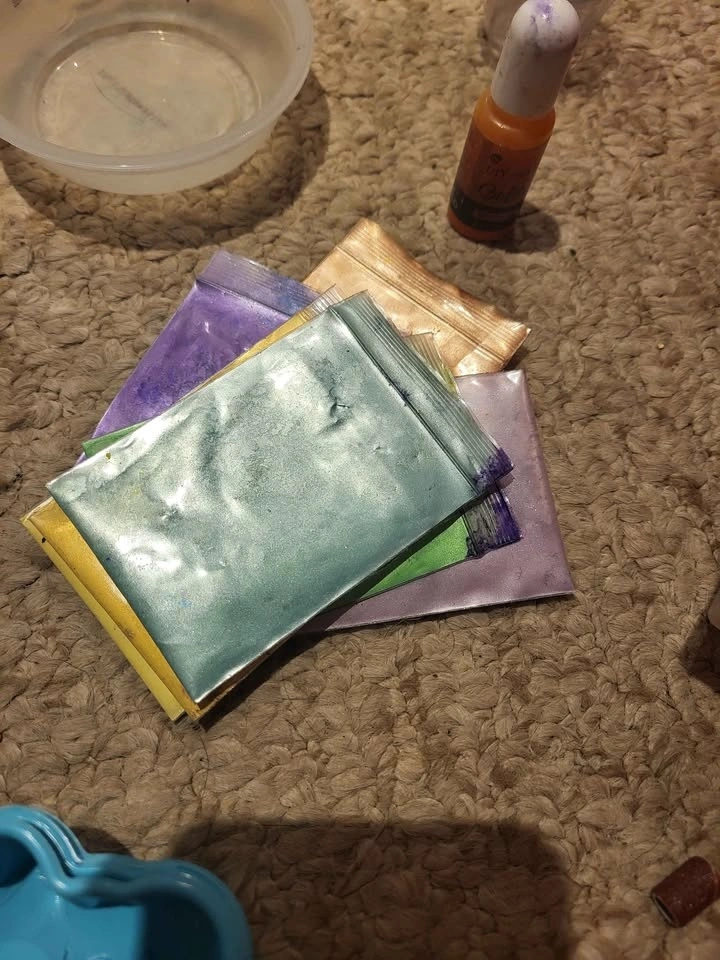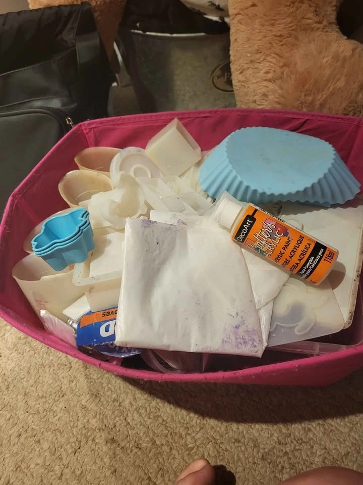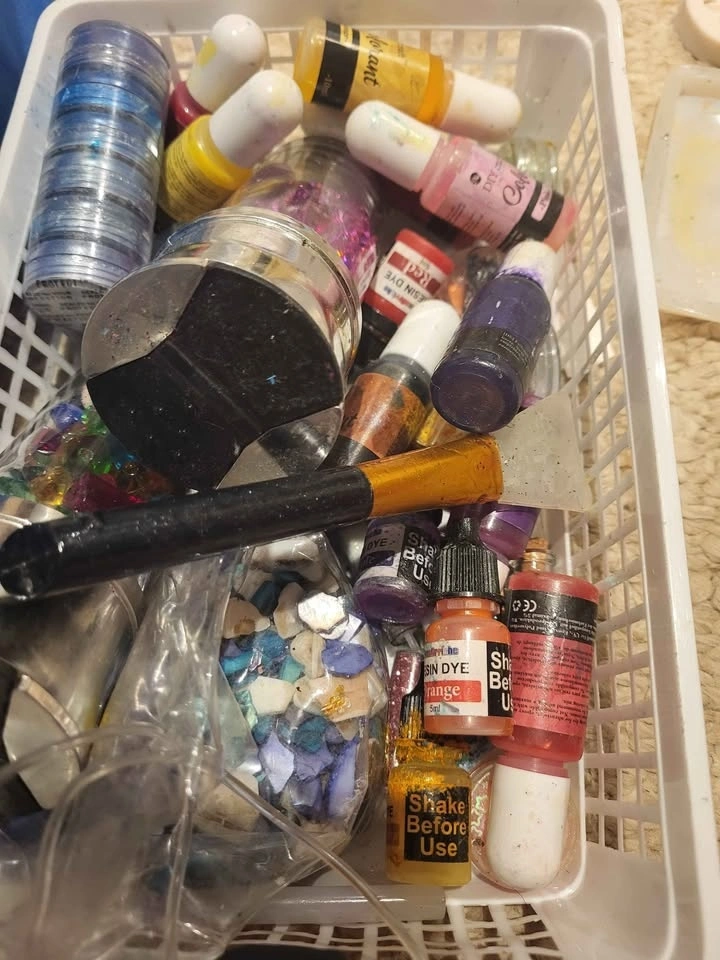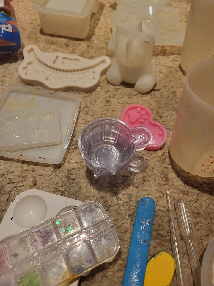 Resin making kit for sale, complete with dyes, molds, glitter, stones, gloves, stir sticks, measuring cups and a protective mat. The molds are [MATERIAL] and have a [CAPACITY] capacity. You can buy the whole package or individual items.