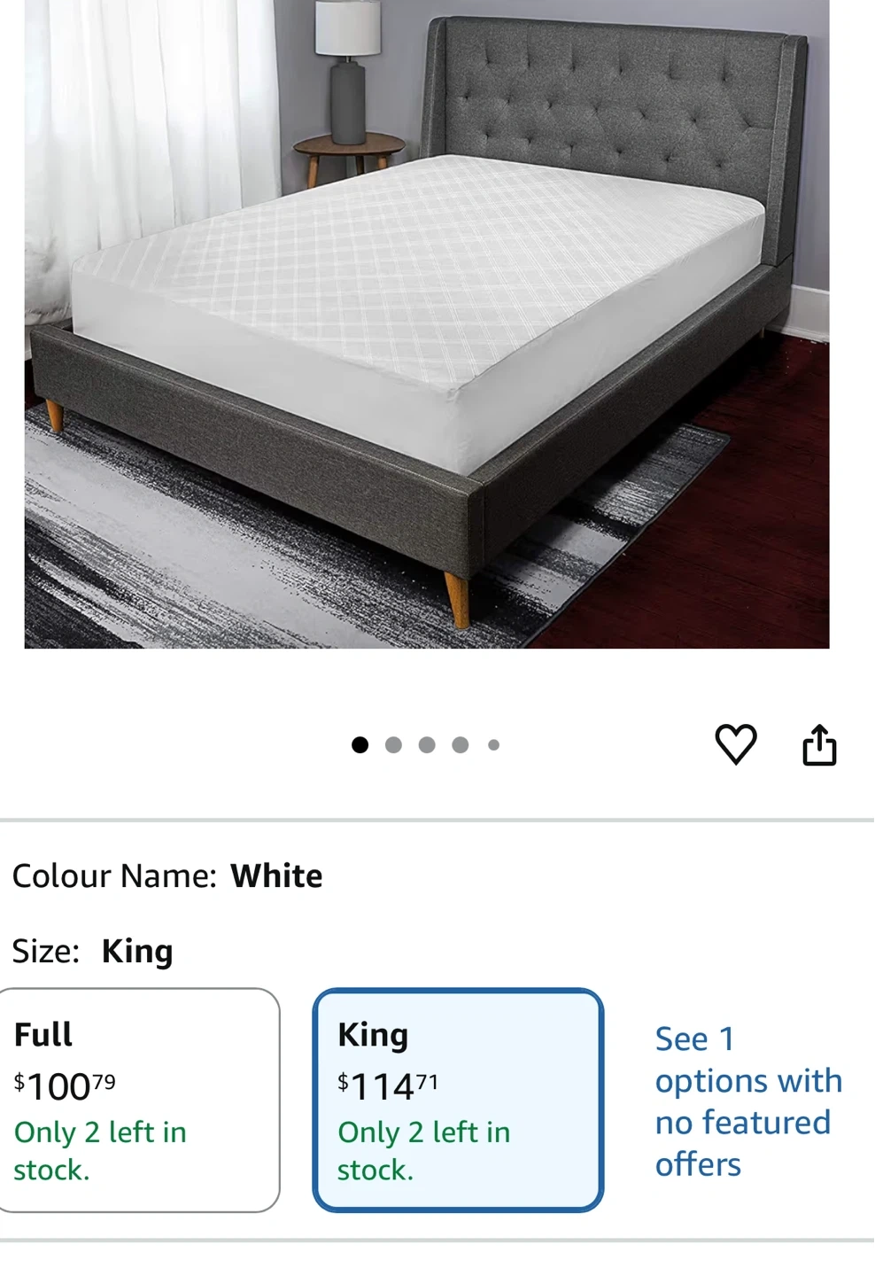Selling a brand new Utopia Bedding quilted mattress pad, still in its original packaging! It's a King size, measuring 78" x 80", and designed with deep pockets (8-16 inches). Made from 100% polyester for a comfy night's sleep. Comes with original box with unopened.