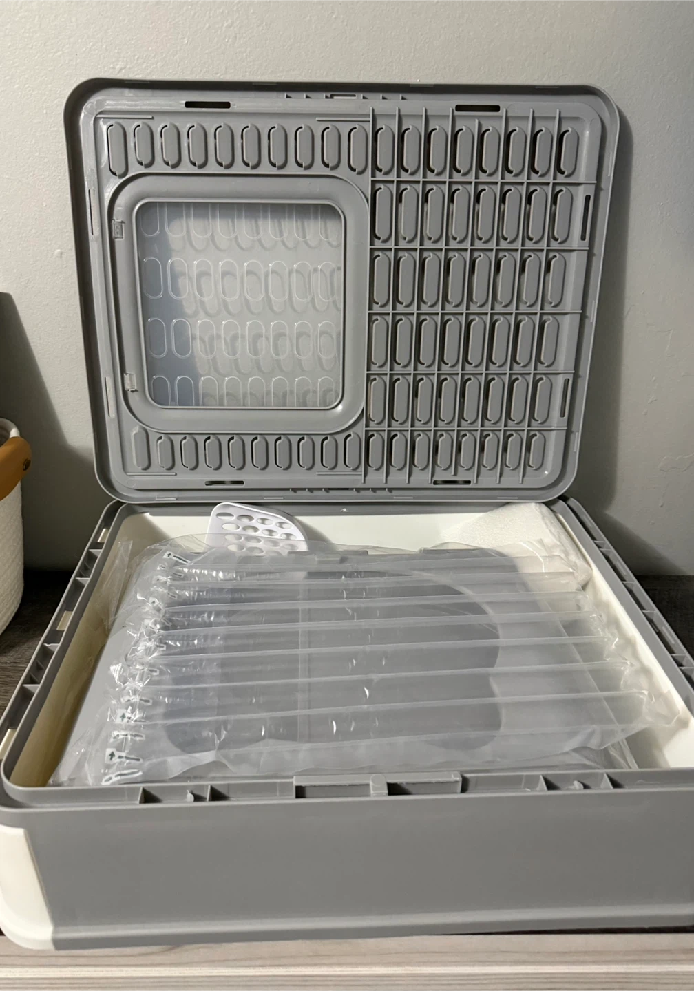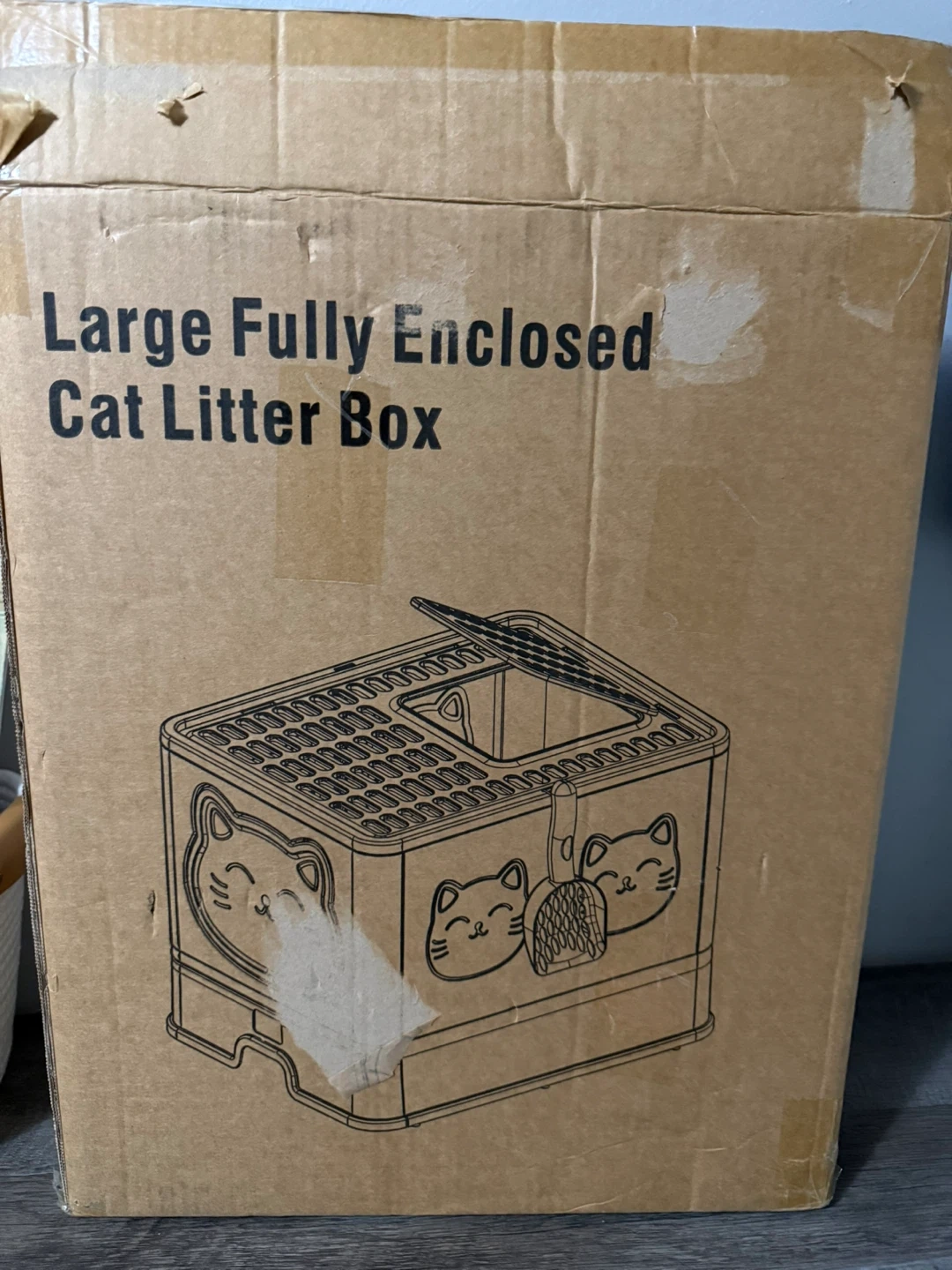 Selling a brand new large enclosed cat litter box in the Gary colour! It comes with a lid and drawer, and is foldable for easy storage. It also includes a scoop for easy cleaning.