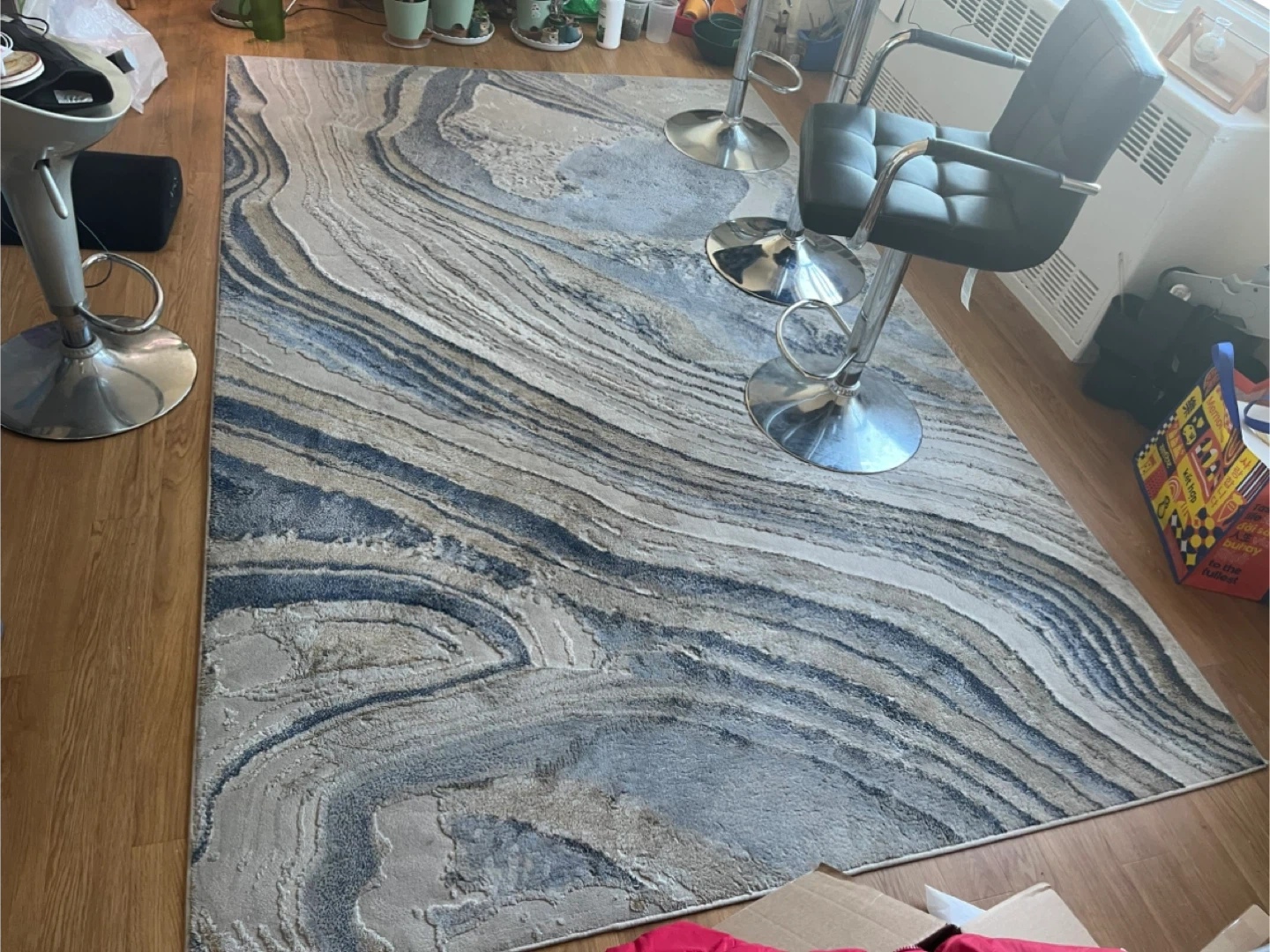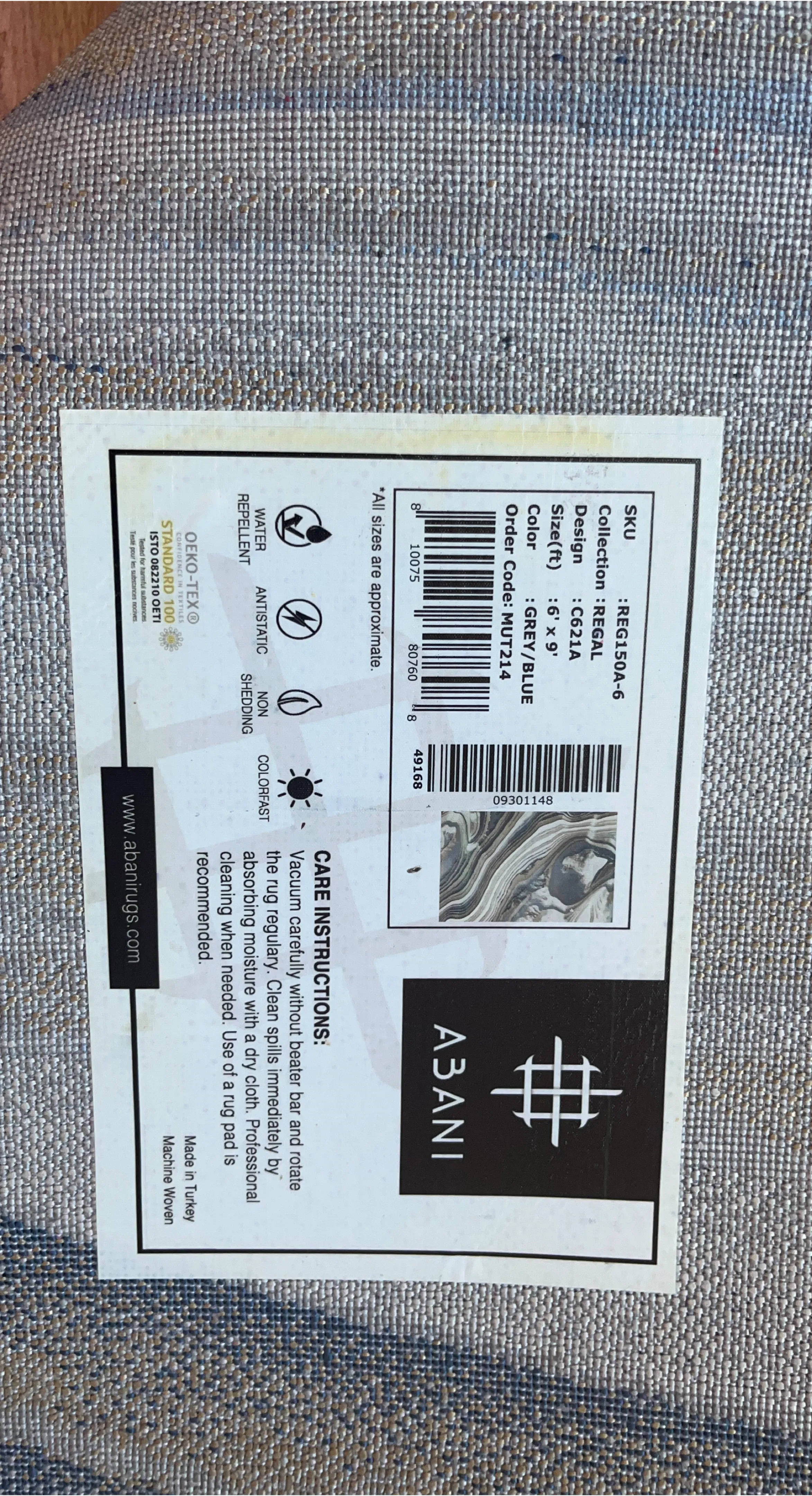 Selling an Abani Regal area rug! It's in great condition and ready for a new home. The rug is 5'3" x 7'6" and features a beautiful grey/blue color scheme. It's also water repellent, anti-static, and non-shedding
