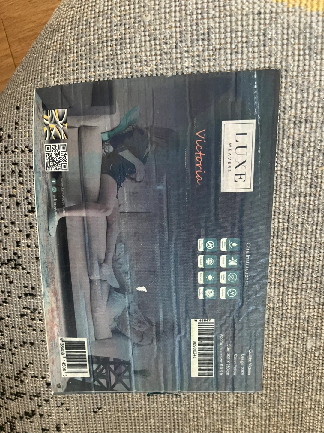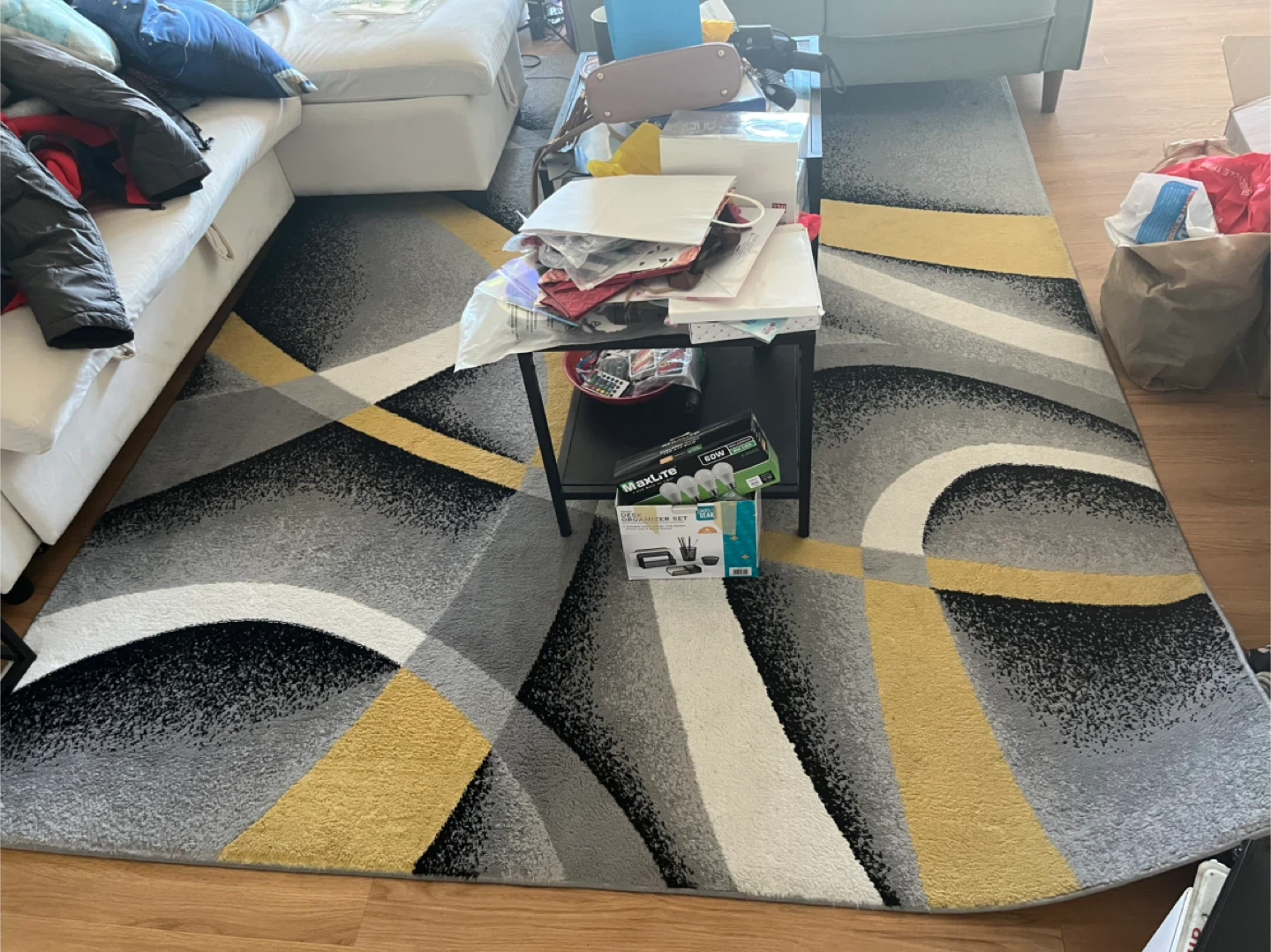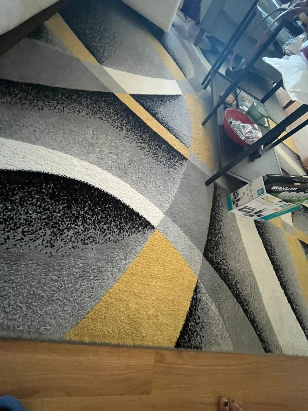 Selling a Luxe Weavers Victoria area rug. It features a stylish geometric design with colors including yellow, gray, and white. The rug measures approximately 5'3" x 7'6" (200 x 230 cm). It's in great condition and ready to add a modern touch to your space!