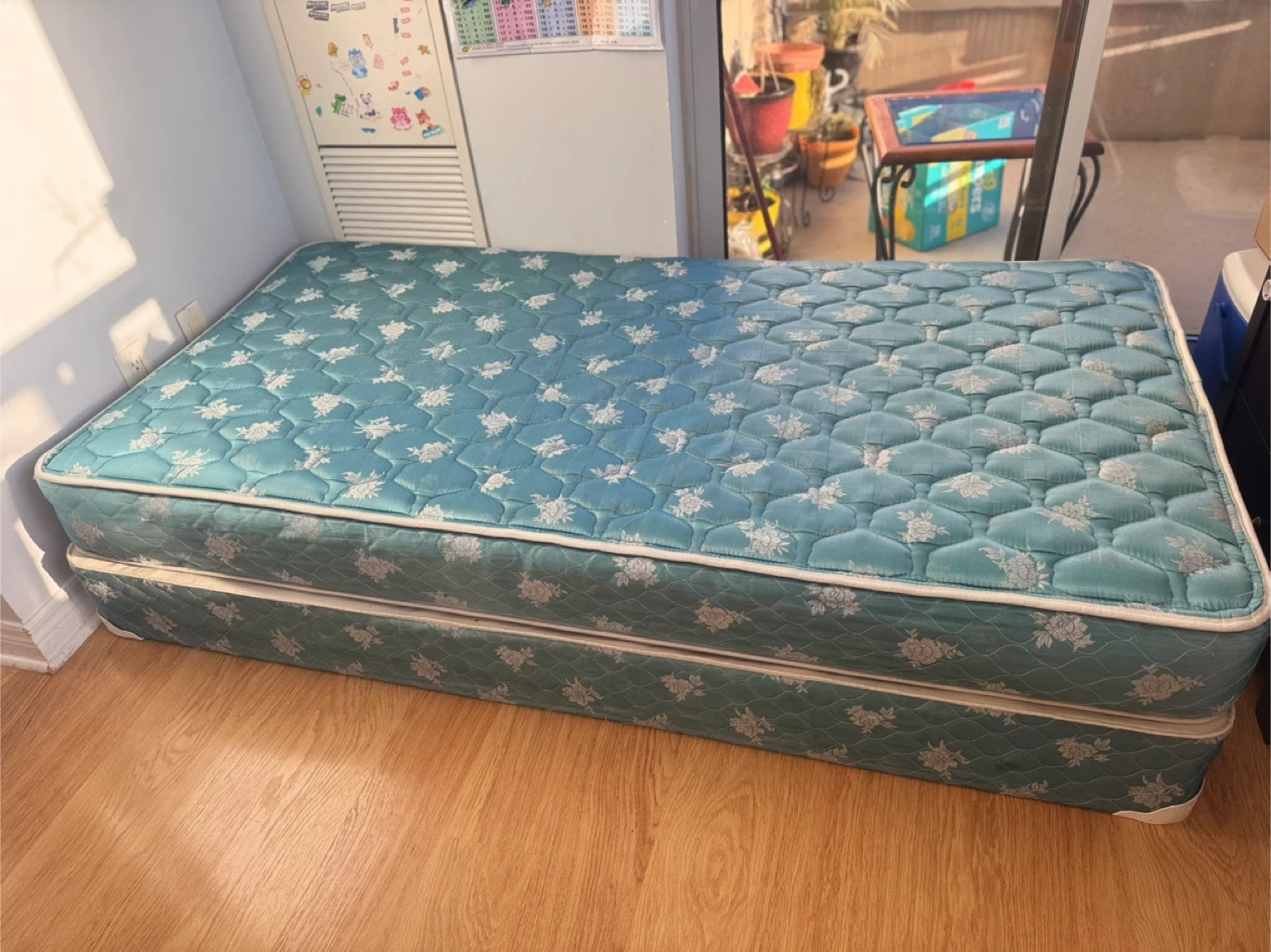 Selling a single size mattress and box spring. It's in good condition and ready for a new home! The mattress has a floral pattern.
