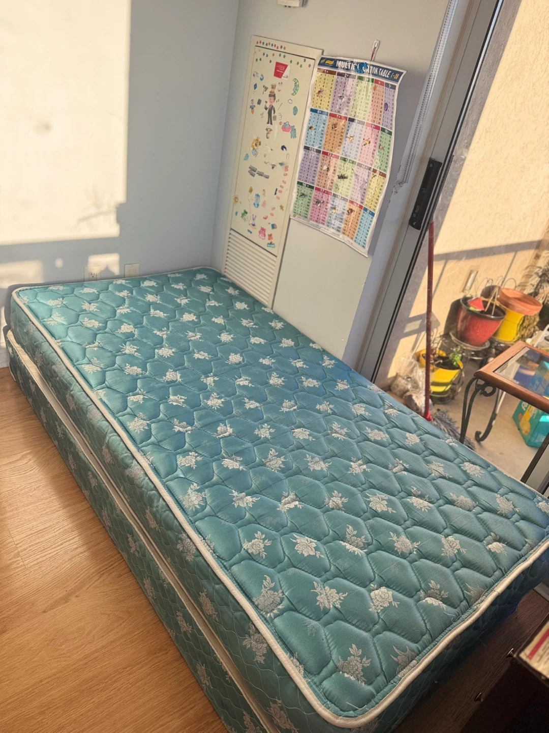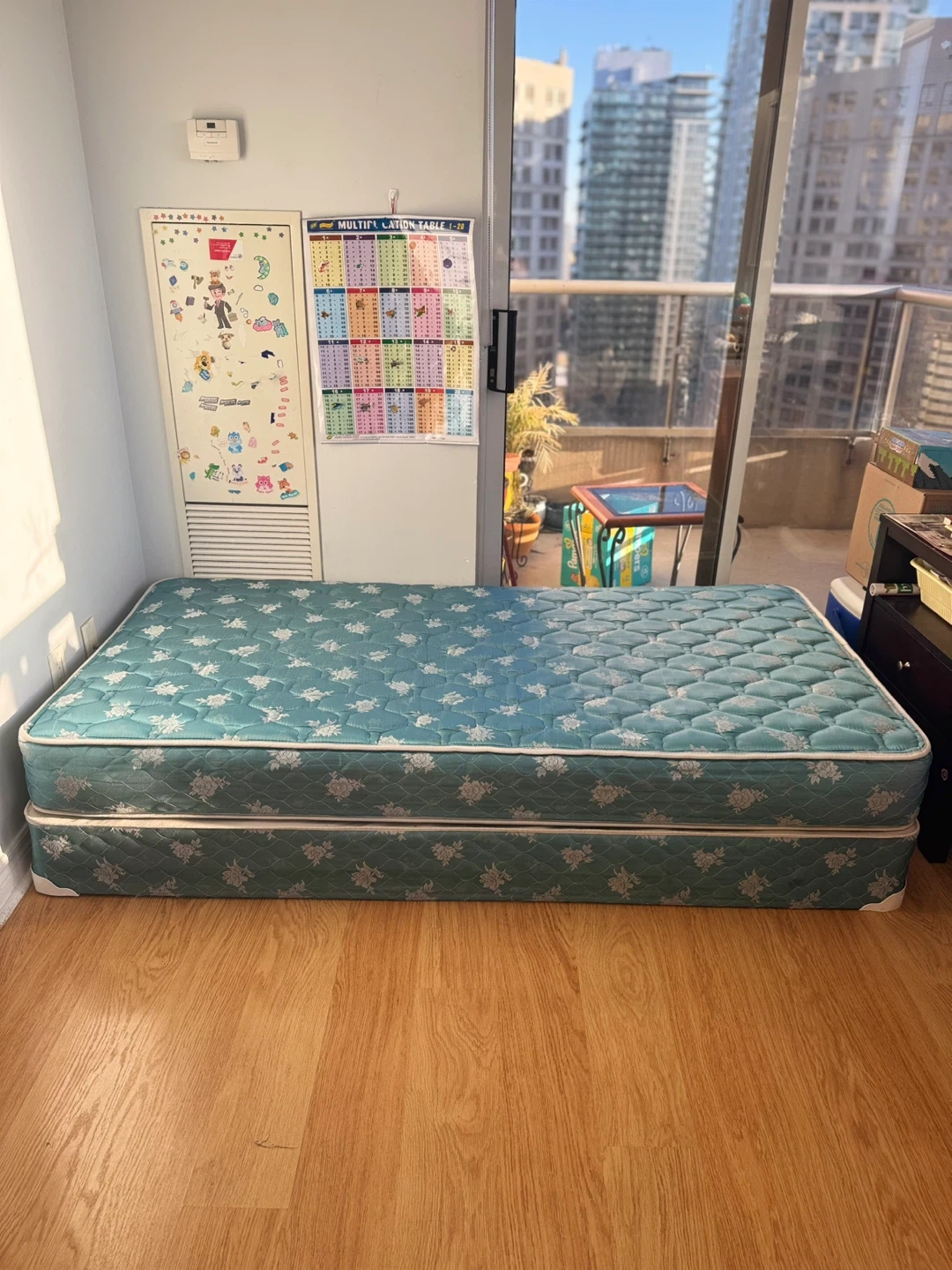 Selling a single size mattress and box spring. It's in good condition and ready for a new home! The mattress has a floral pattern.