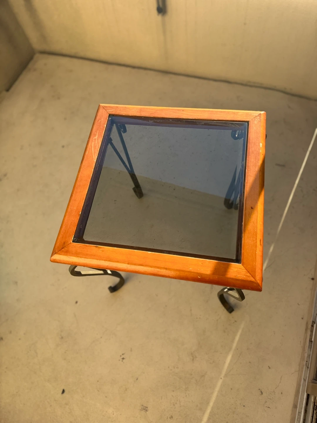 Selling a lovely glass top end table! The frame is wood with a charming dark metal scroll design for the legs. It would look great next to a couch or bed!