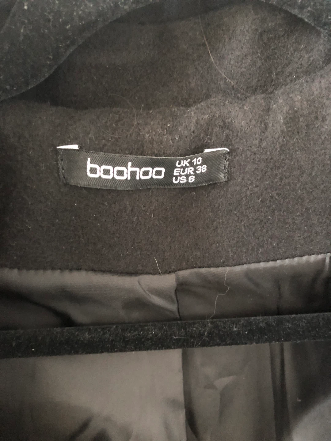 Selling a stylish black trench coat from Boohoo, an UK brand. It's a size US 6, which is a UK 10 or EUR 38 - very soft in touch with a light cashmere feel. Made in Italy!