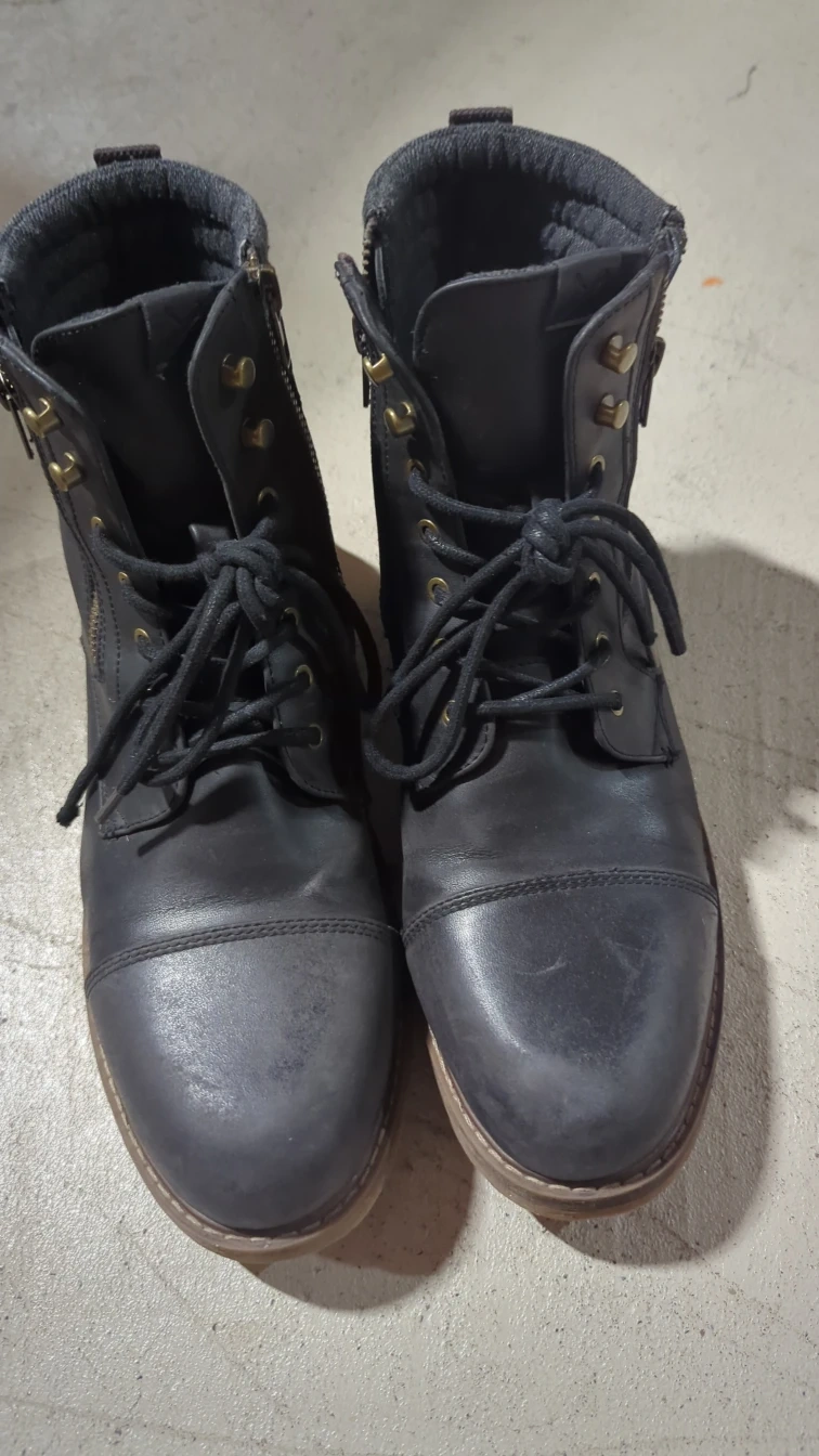 Selling a pair of black ankle winter boots. They feature a lace-up design with a side zipper. They are in good condition and ready for a new owner!