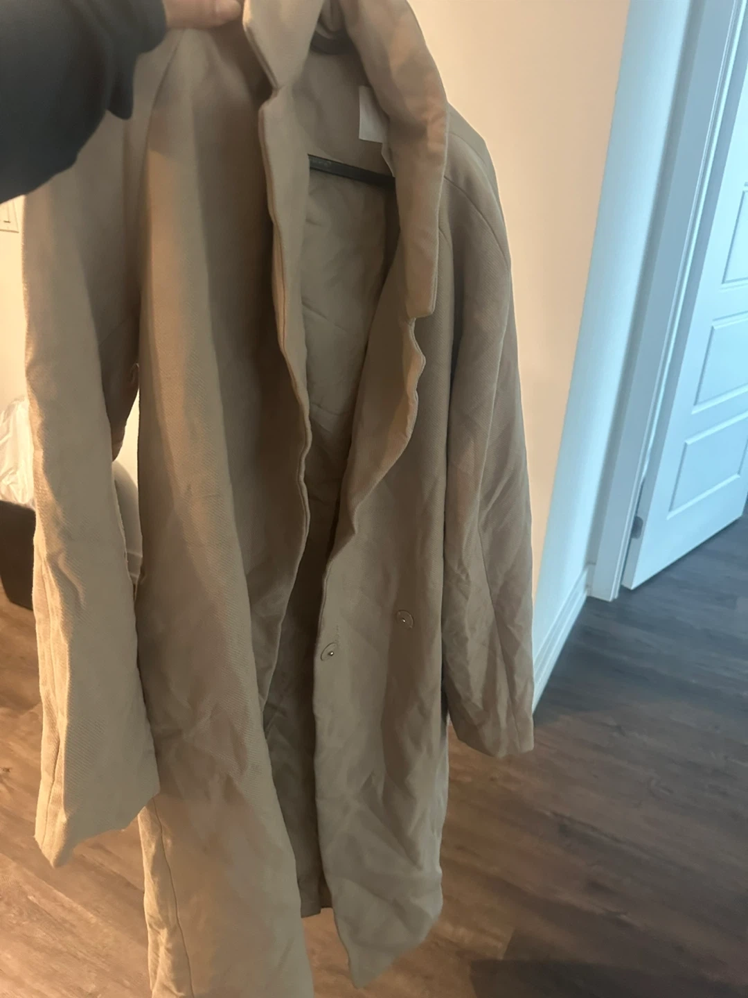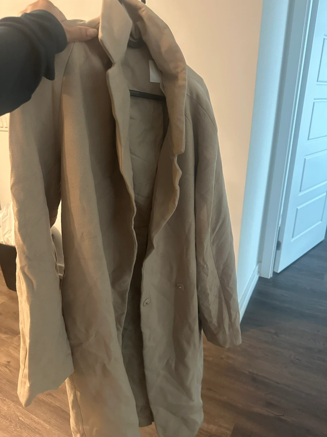 Selling a beige trench coat. It's in great condition and ready for a new owner! It's a versatile piece that can be dressed up or down. Perfect for layering during the cooler months.