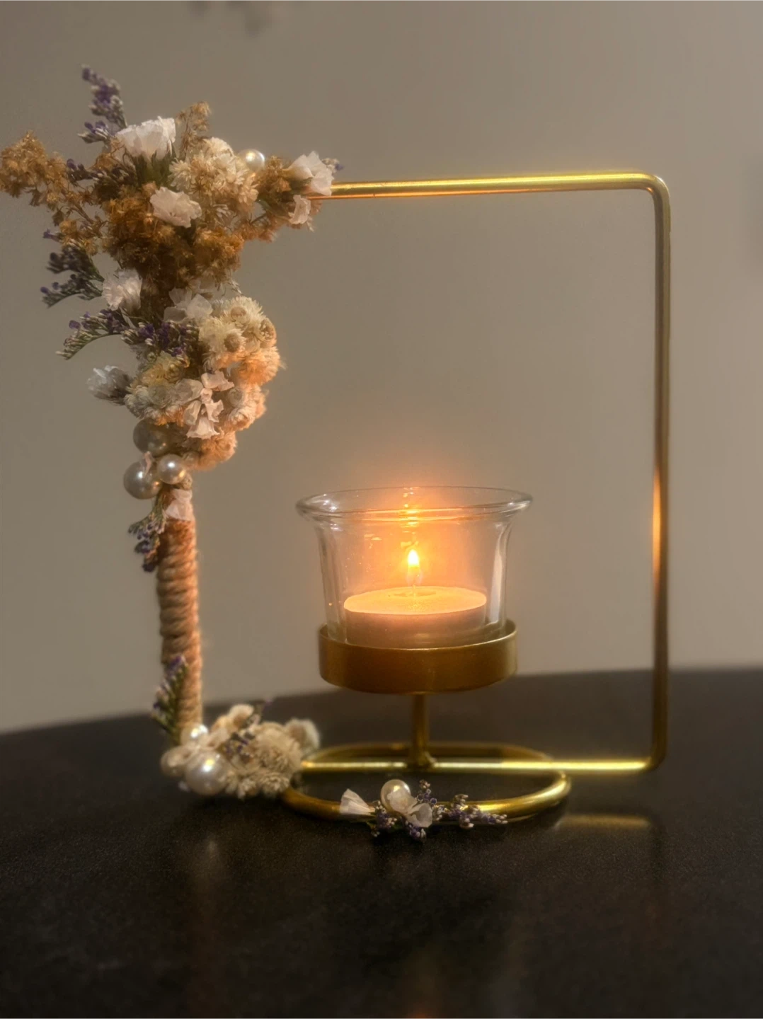Selling a decorative candle holder with a gold frame and floral accents. It's a unique piece that adds a touch of elegance to any room. The candle holder is in great condition and ready to brighten up your space!