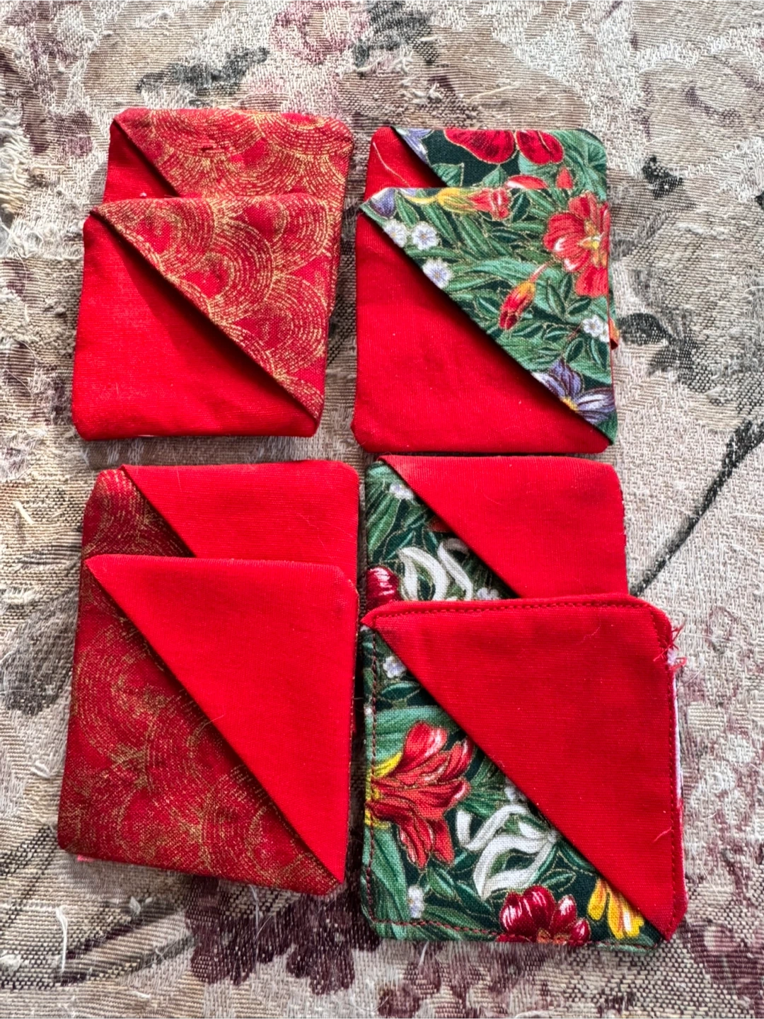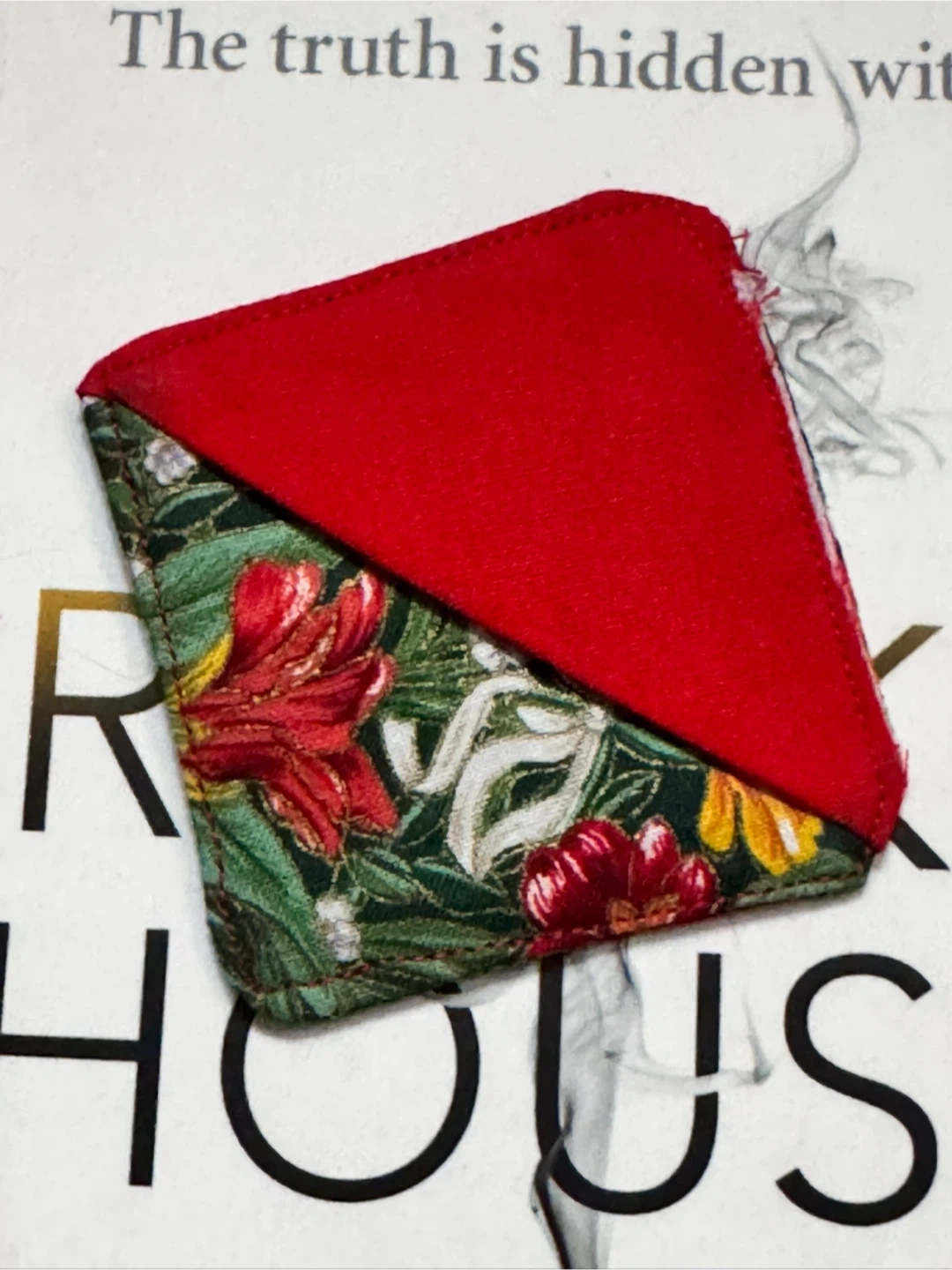 handmade corner bookmarks. These cute bookmarks are perfect for keeping your place in your favourite books. They come in two different patterns, one with a red and gold design, and the other with a floral pattern. Add a touch of charm to your reading!