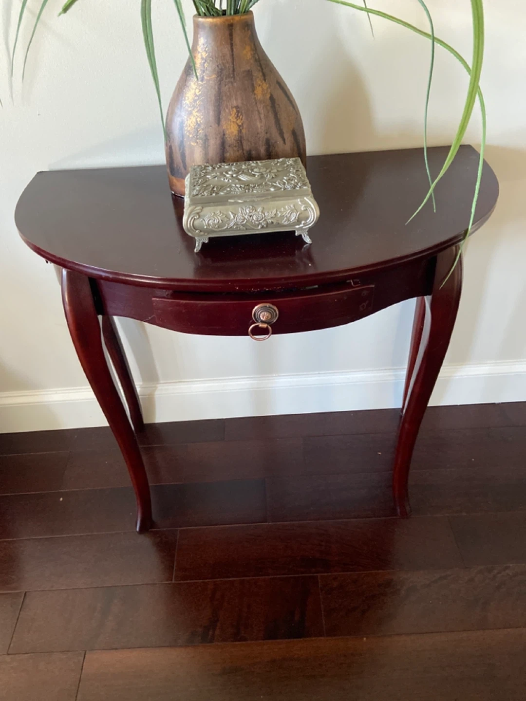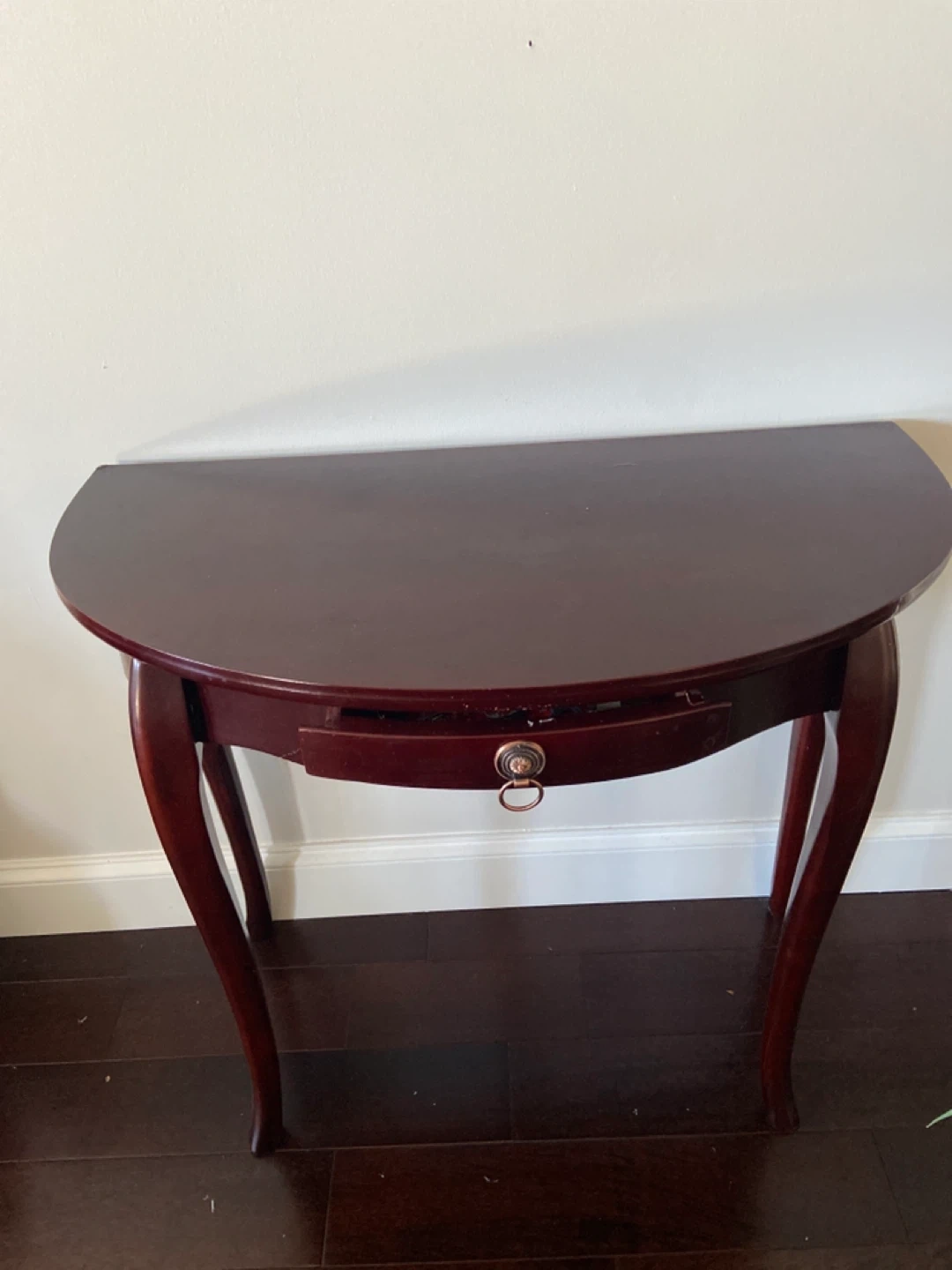Selling a lovely half-moon shaped accent table. It's a beautiful piece for any entryway or living space. It features a small drawer with a decorative pull. The table has a rich, dark wood finish.