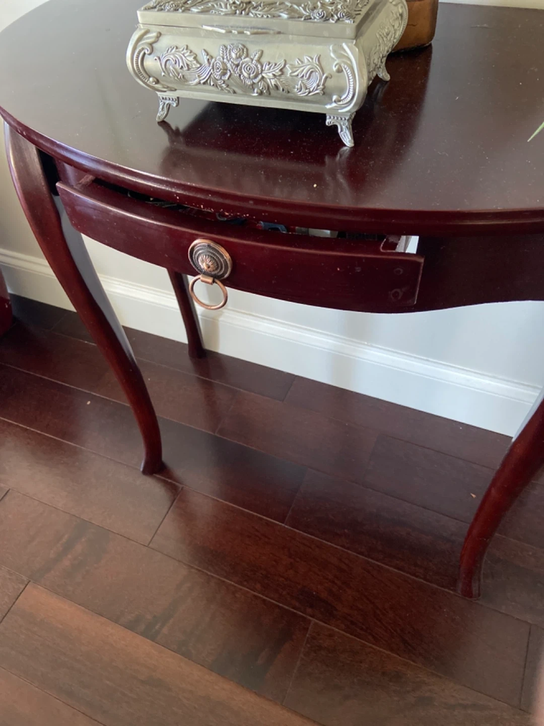 Selling a lovely half-moon shaped accent table. It's a beautiful piece for any entryway or living space. It features a small drawer with a decorative pull. The table has a rich, dark wood finish.