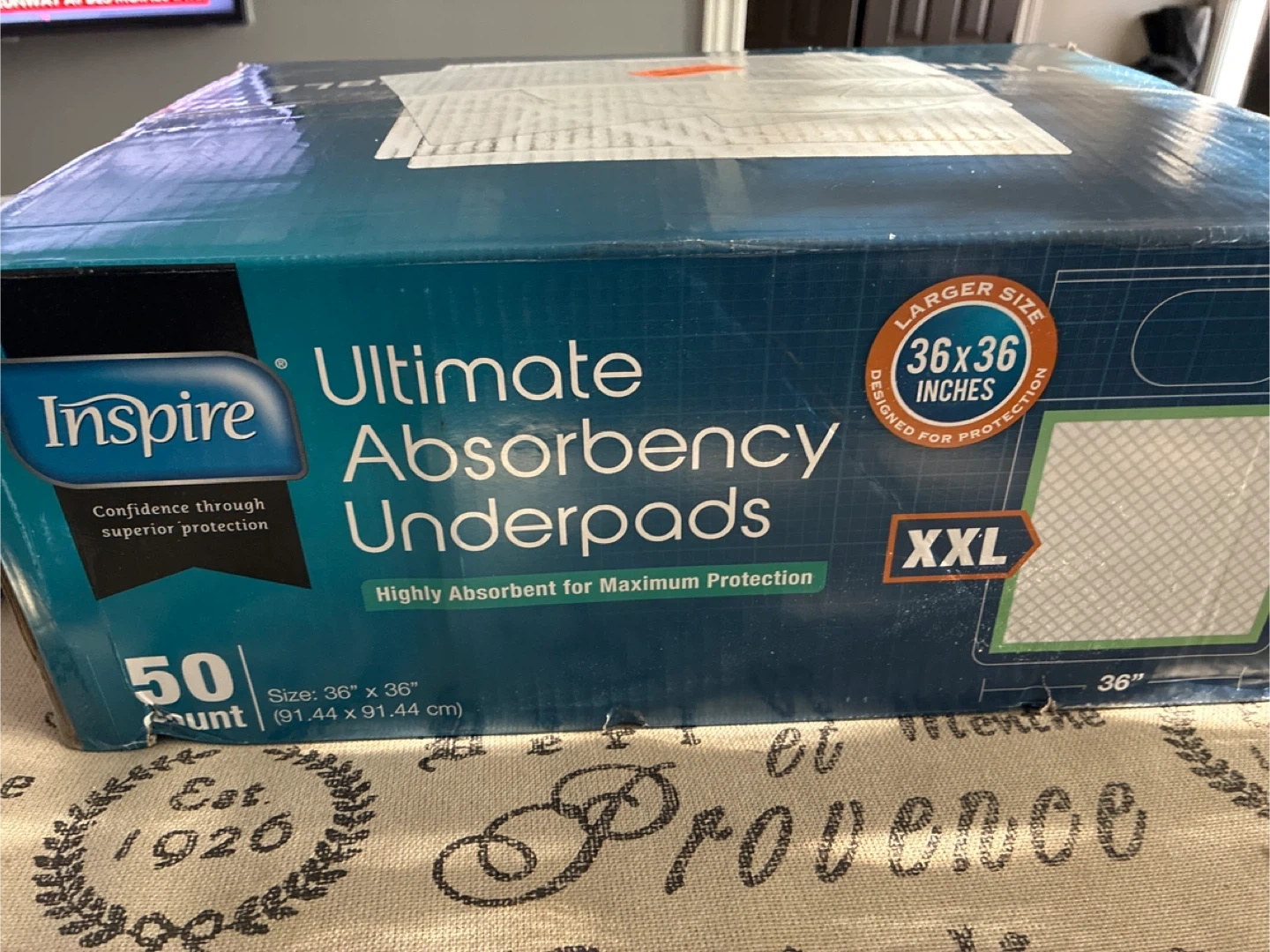 Inspire Super and Ultra Absorbent Disposable Bed Pads, 36" X 36", Pack of 50 with Adhesive, XXL