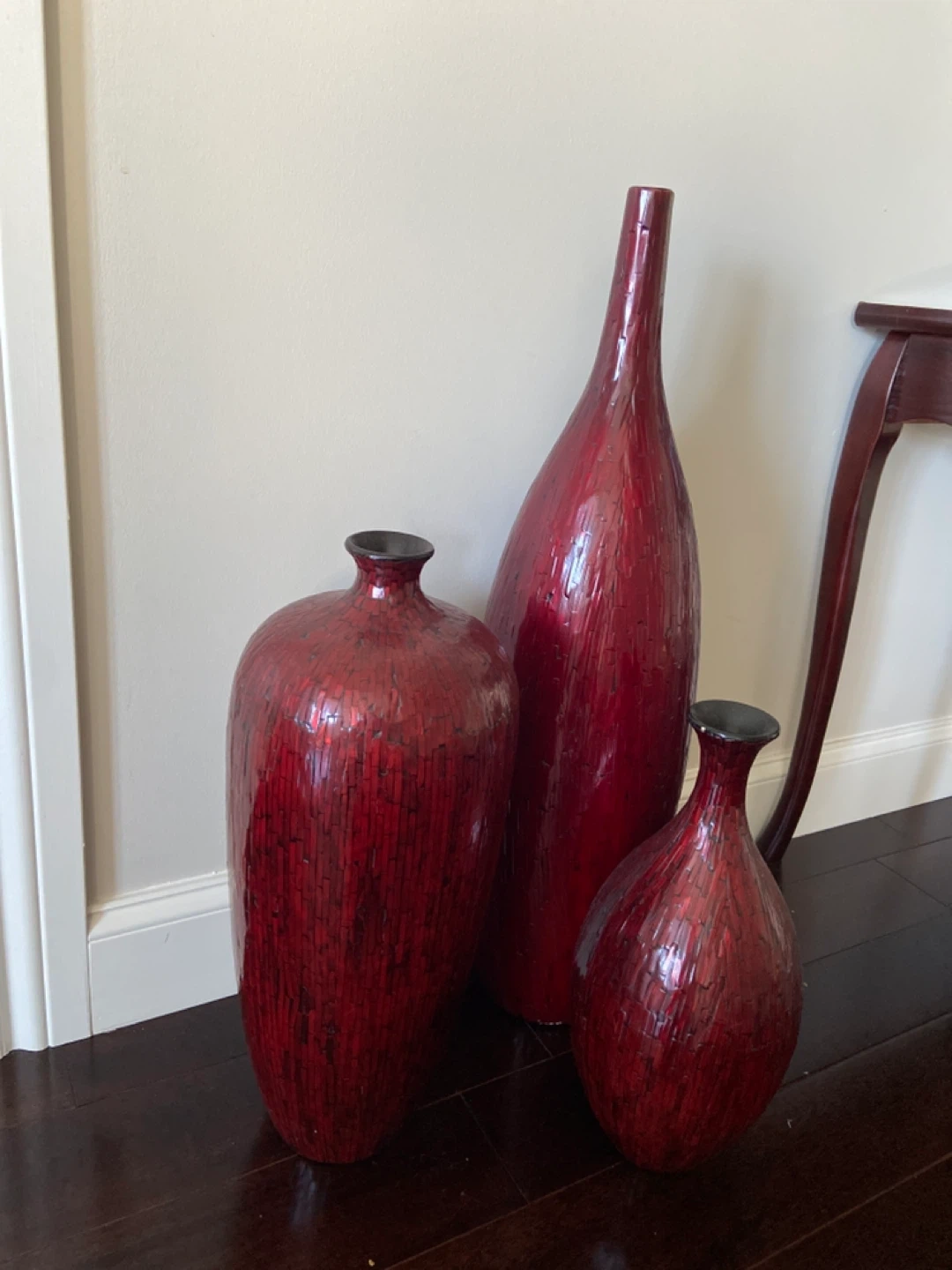 Here's a set of three decorative vases with a beautiful red mosaic pattern. They would look great as a centrepiece or accent pieces in your home. They vary in size and shape, adding visual interest to any room!