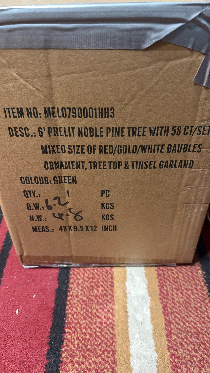 Selling a 6-foot pre-lit Noble Pine Christmas tree that comes with 58 red, gold, and white baubles, an ornament, a tree top, and a tinsel garland. The tree is green and the box measures 48 x 9.5 x 12 inches. It's all ready to brighten up your holiday season!