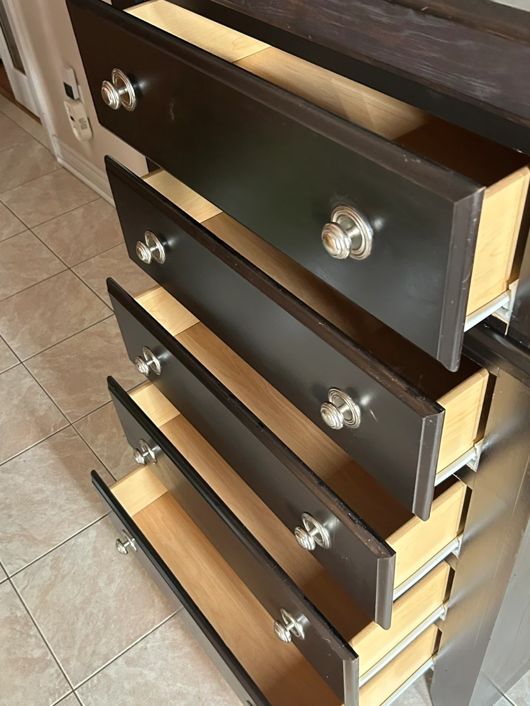 Selling a dark brown 5-drawer dresser. It's in great condition and would be a lovely addition to any bedroom or living space! All drawers are functional and ready to use