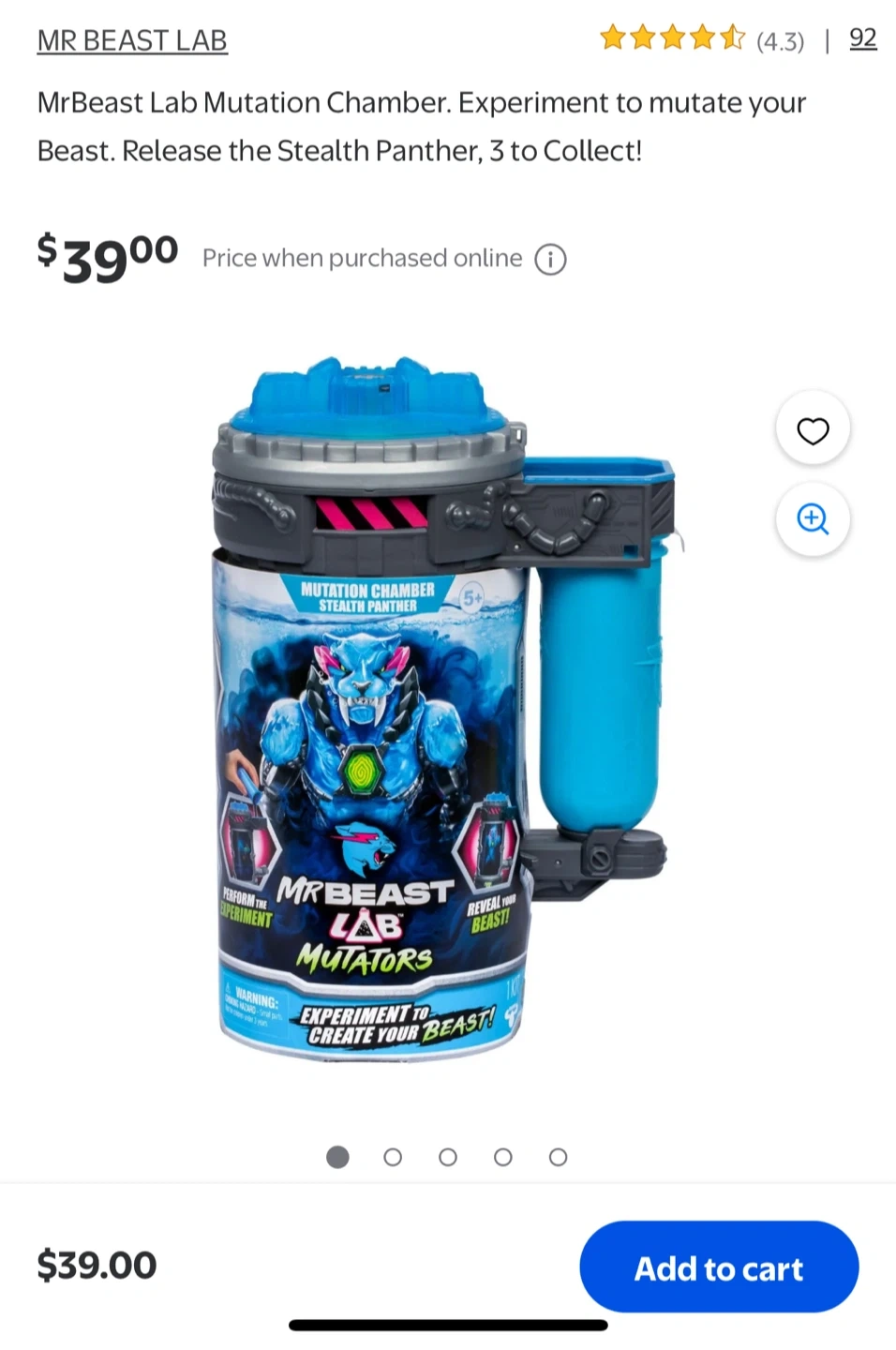 Buy & SellNew Sealed MrBeast Lab Mutators Stealth PantherNew Sealed MrBeast Lab Mutators Stealth Panther$20Selling a brand new sealed MrBeast Lab Mutators Stealth Panther toy! It's an experiment to create your beast! Retails for $39. Perfect for gifting!ConditionNewWHERE TO MEETMarkham and LawrenceView MapSELLERverifiedUrsulaWoburn43135 reviews0 chats·0 favorites·1 views