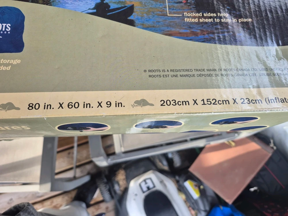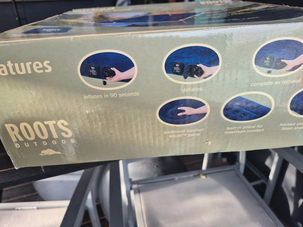 Selling a Roots Outdoor airbed with a built-in pump! It's queen size and comes in the original box. It inflates in 90 seconds and has a built-in pillow for maximum comfort. The dimensions are 80 inches x 60 inches x 9 inches.