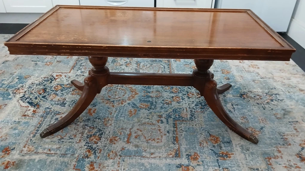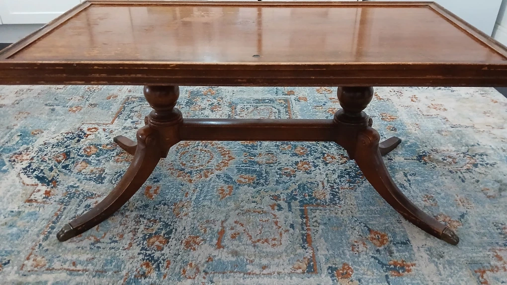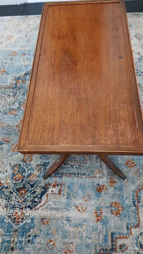 Selling a vintage wooden coffee table. It has a rectangular top and a unique pedestal base. It would be a great addition to any living room! This coffee table is a Duncan Fife. Top could use a coat of varathane.