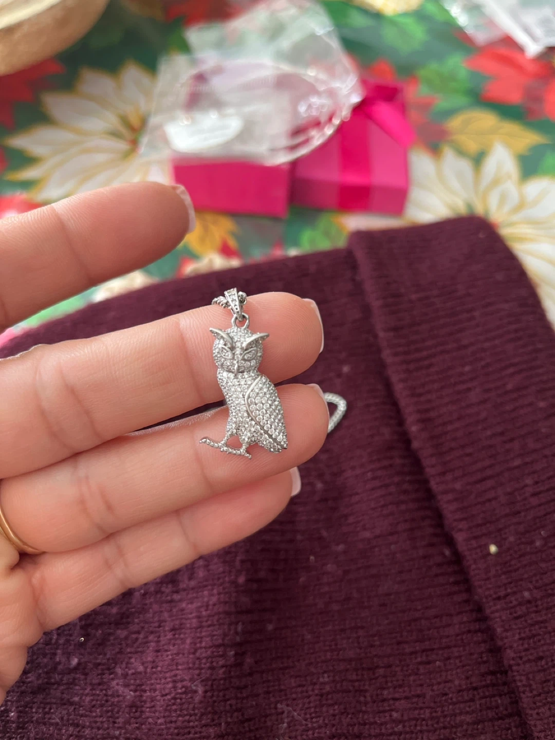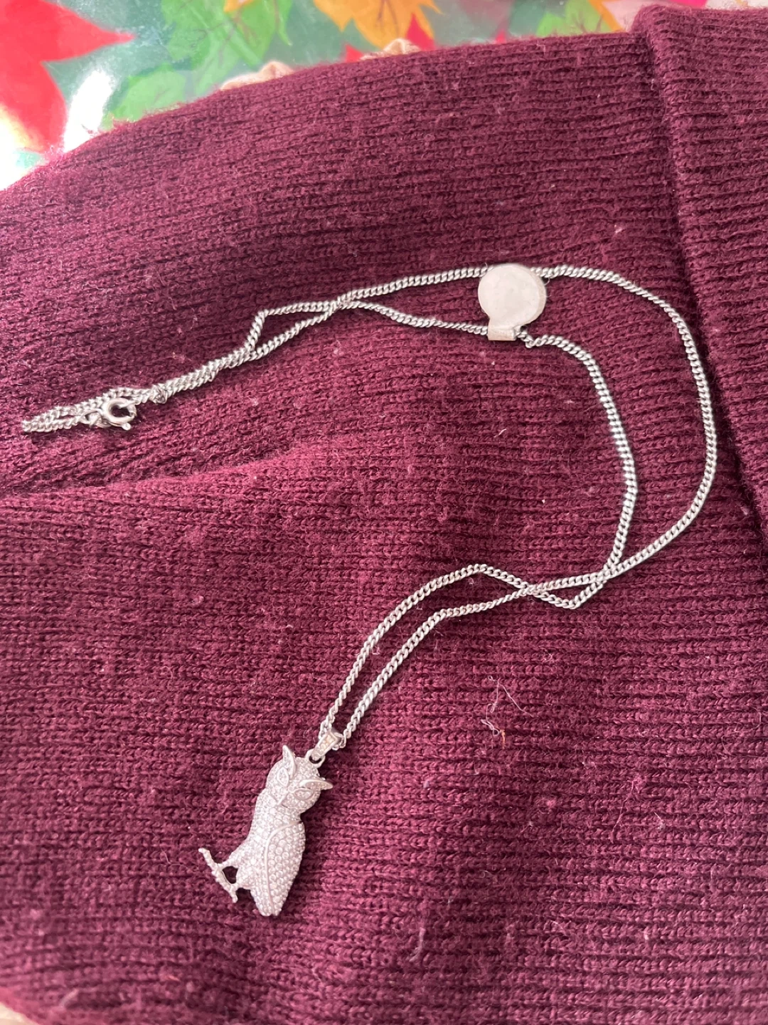 Selling a cute owl pendant necklace. It's a silver-colored metal with sparkly details. Perfect for adding a bit of whimsy to any outfit!