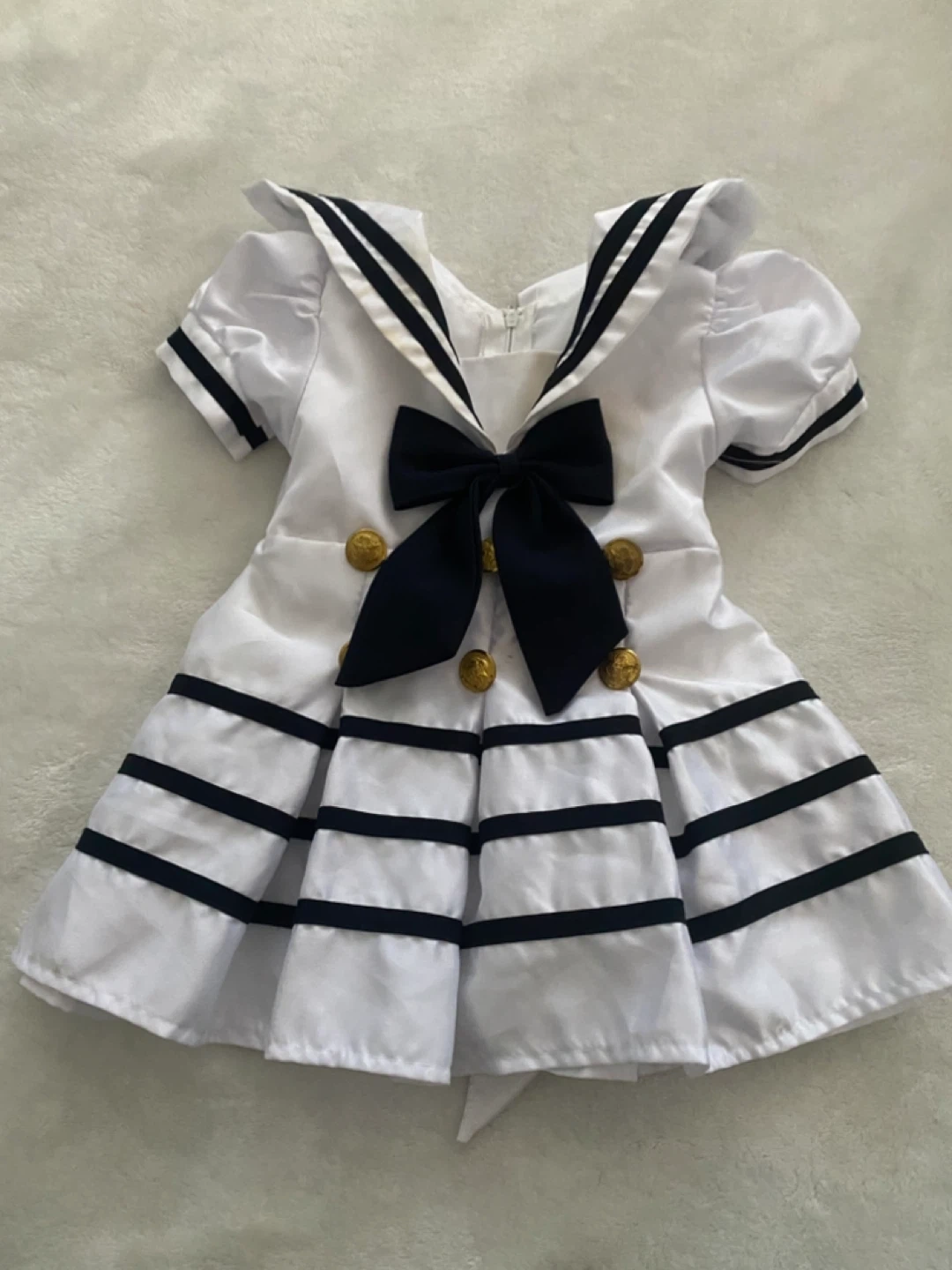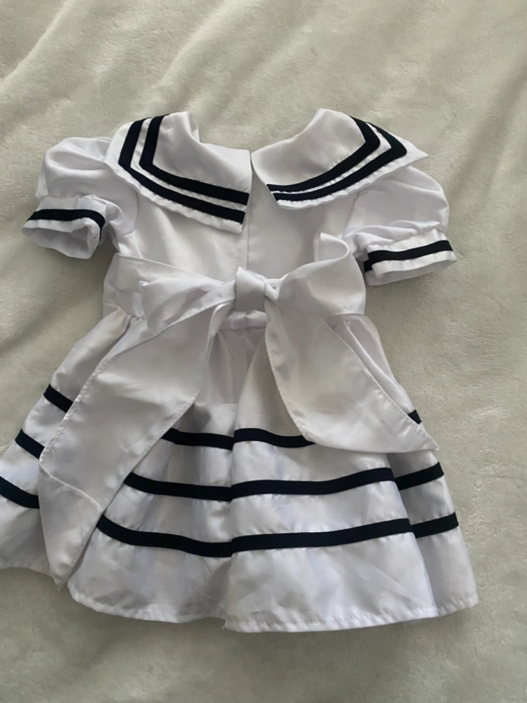 Adorable sailor dress in white with navy blue accents! Perfect for a special occasion or just for fun. Features a cute bow and ribbon tie in the back