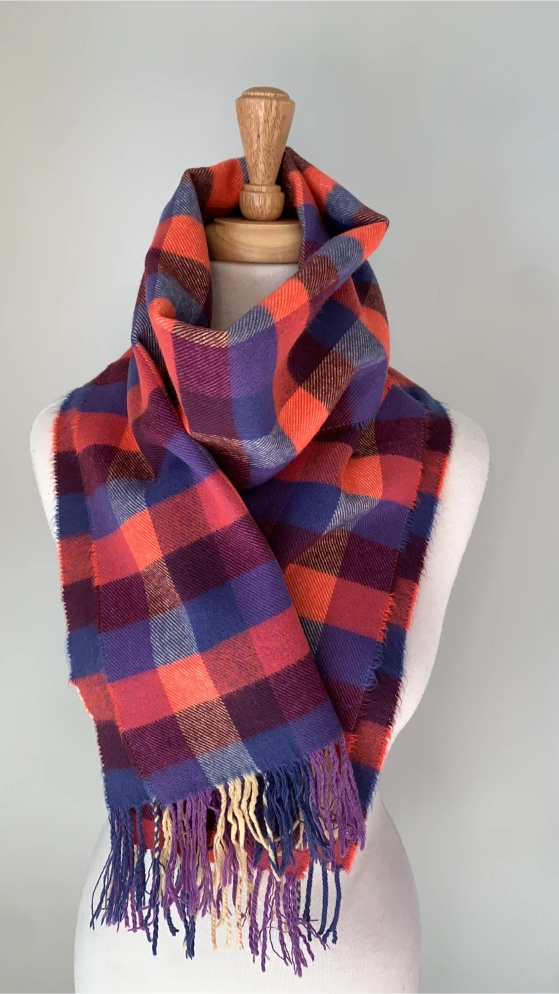 A colourful vintage checkered scarf in a brand new condition! It is featuring orange, purple, and blue tones! It has a soft texture, and the ends are finished with fringes.