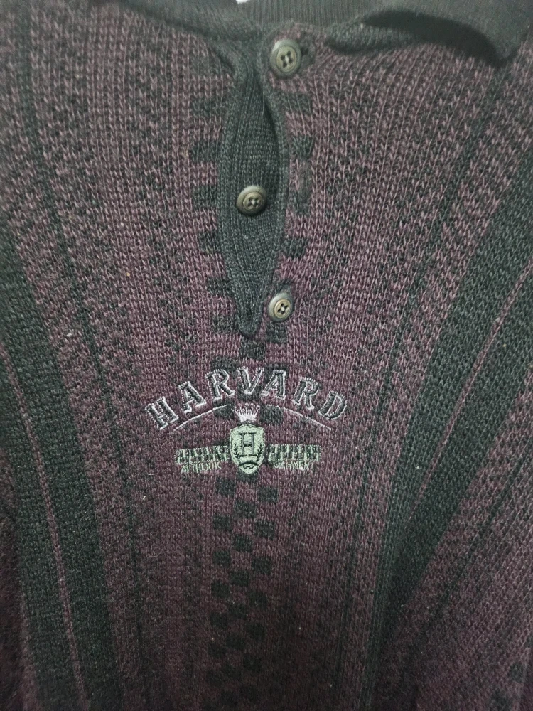 Selling an Alberto Bassan sweater with a Harvard emblem. It's a wool blend, made in Italy. The sweater features a buttoned collar and a stylish pattern in black and purple. Perfect for staying warm and showing off some Ivy League style!